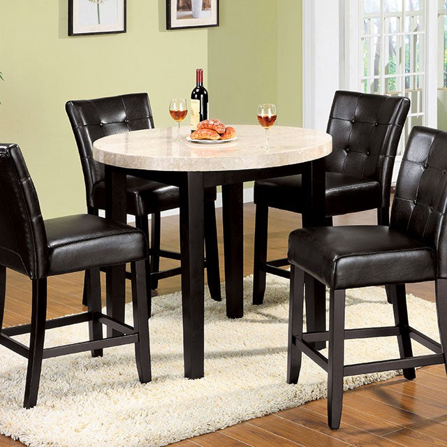 Six comfortable leatherette parson chairs complement the ivory marble square table top of this dynamic dining set. The counter height table is constructed of solid woods and is finished in modern espresso.
