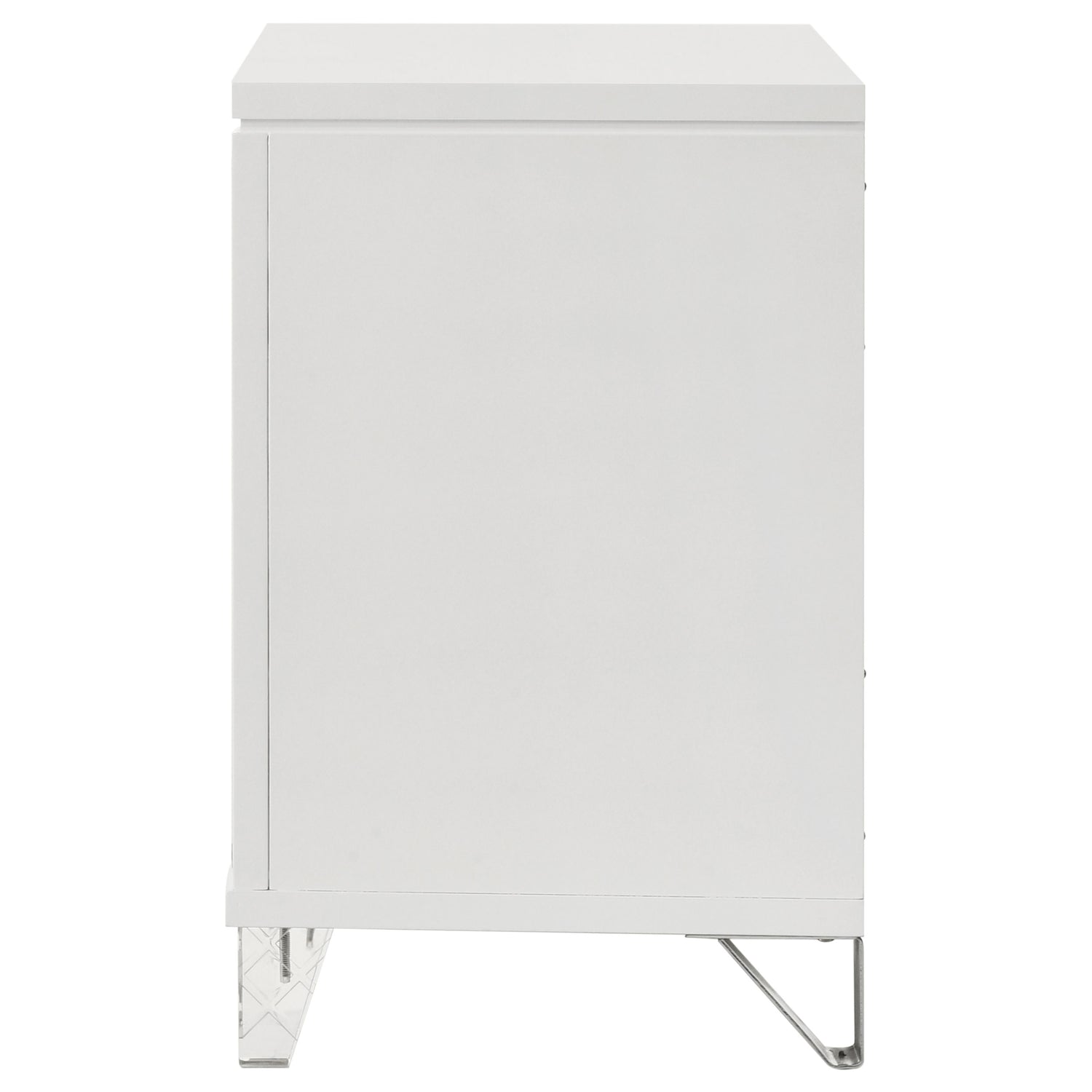 Complete your bedroom ensemble with this elegant 2-drawer nightstand, designed with a modern Italian aesthetic. The white finish, accented with mirror framing and polished chrome metal hardware, creates a striking look. Featuring picture framed recessed panels with an embossed herringbone graphic pattern, this nightstand offers both style and functionality. The top drawer includes cord management access, making it perfect for your rechargeable devices. Crafted from solid hardwood, MDF, particle board, and mirror, this nightstand is a luxurious addition to any bedroom.