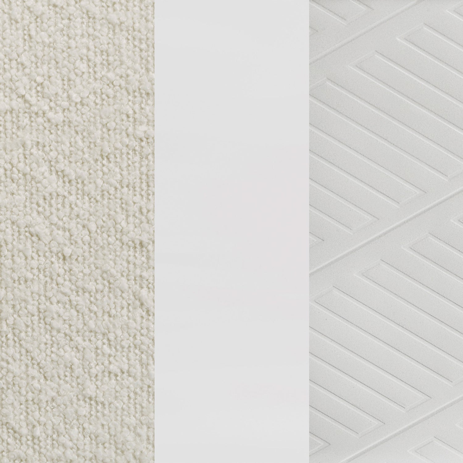 Indulge in the luxurious elegance of this modern Italian-designed bed, perfect for creating the opulent bedroom you deserve. The striking, clean lines and picture framed recessed panels with embossed herringbone graphic patterns exude sophistication. Accented with mirror framing and acrylic legs, the bed also features polished chrome metal hardware and touch LED lights in the 3-dimensional headboard, upholstered in off-white boucle fabric. Crafted from solid hardwood, MDF, particle board, foam, and mirror, this bed offers both style and durability. Available in queen, eastern king, and California king sizes to suit your preferences.