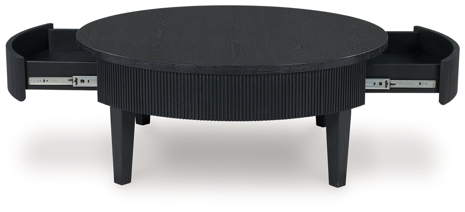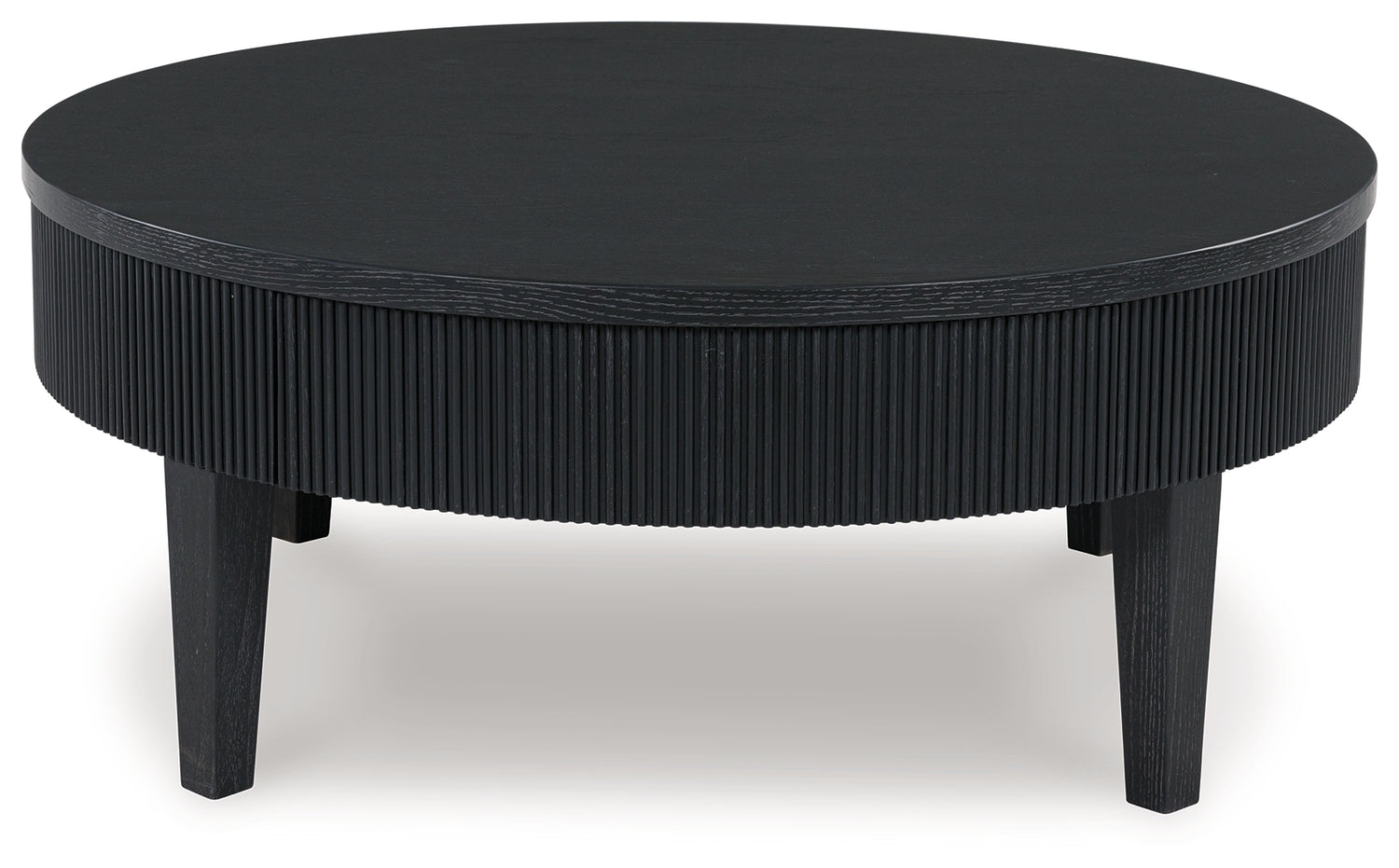 Classic and cool in dark charcoal, this coffee table brings contemporary convenience to your living room. Short on storage? The trendy reeded apron conceals a drawer perfect for remotes, controllers and other entertainment accessories. What a perfect marriage of style and functionality.