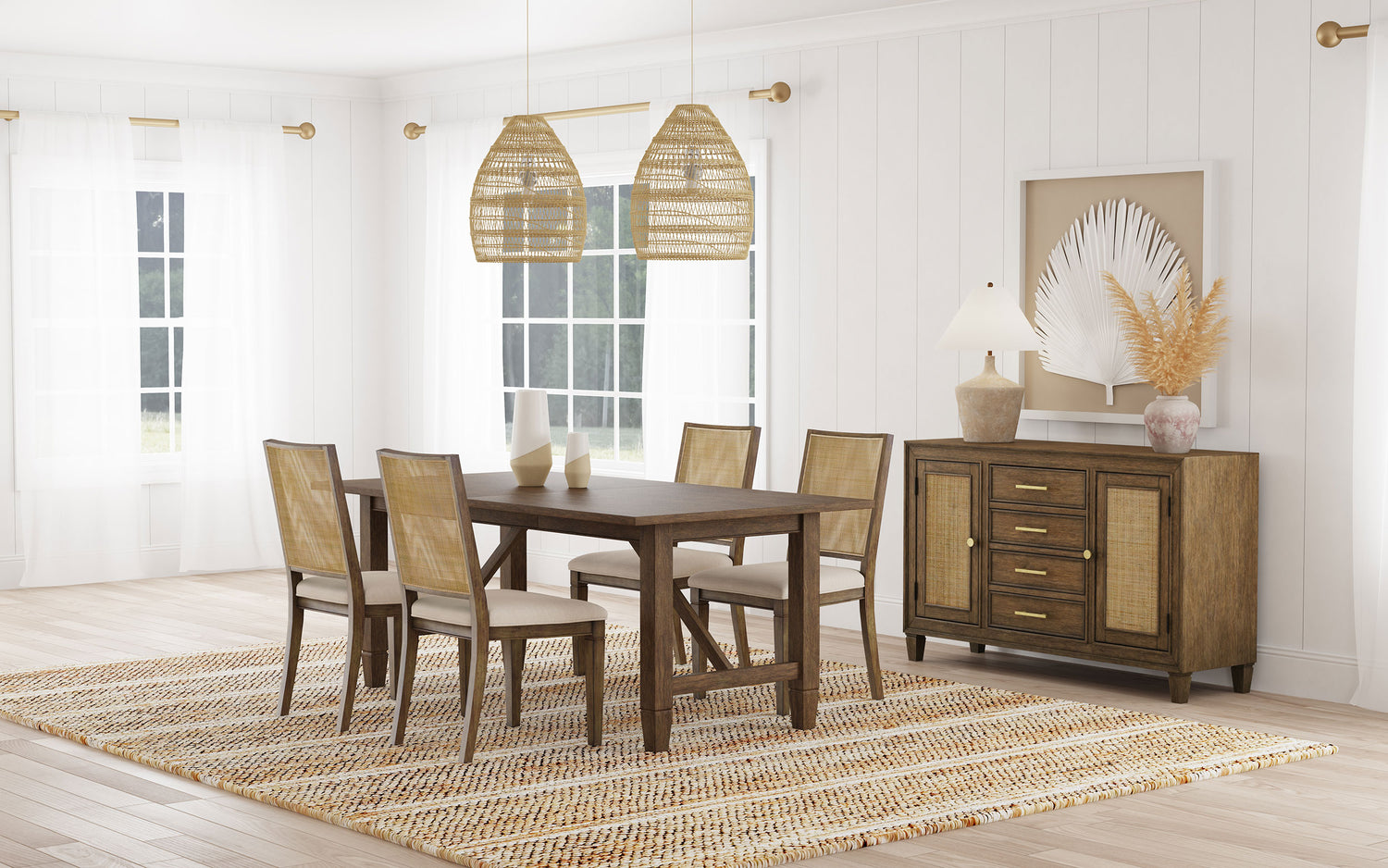An impressive amount of storage pairs with impeccable style in a modern farmhouse sideboard. Simply charming in your dining room, it boasts a center core of four drawers, with two side cabinets that add a spot for larger items and serve ware. The sideboard is styled in a natural wood finish that's warm and inviting while each door features a lighter rattan panel, delivering airy ambiance and breezy character. Bar pulls in a warm metallic hue highlight the drawers, while doors feature matching round knobs. Serve delicious buffets on the tabletop, or choose an assortment of decor that adds a personalized touch.