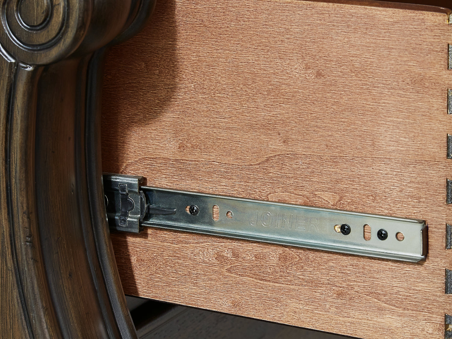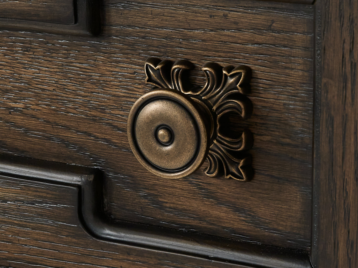 Series Features: Opulent Traditional styling. Inspired by the grandeur and grace of Old World traditional style, this bedroom collection is nothing short of stunning. A choice blend of materials is accented by detailed ornamental appliques and large-scale decorative scrolled pilasters make a grand stance. Made with hardwood solids, oak and ash swirl veneers with MDF substrates and cast resin components. Finished in a dark brown coloration. The panel bed features sculptural ornate details upholstered headboard and footboard is covered in a button tufted softly textured chenille in a pewter color. Poster bed features grand mansion style posts and metal canopy with sculptural ornate details, upholstered headboard covered in a button tufted, softly textured chenille in a pewter color. Top of cases include an ash swirl border and dark walnut inlay. Accented with antique gold toned drawer pulls. Three drawer night stand features a concealed drawer for keeping valuables out of sight and includes a 110V power supply with dual USB charging ports.
