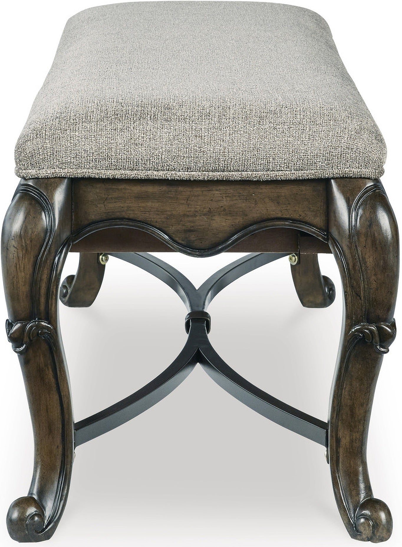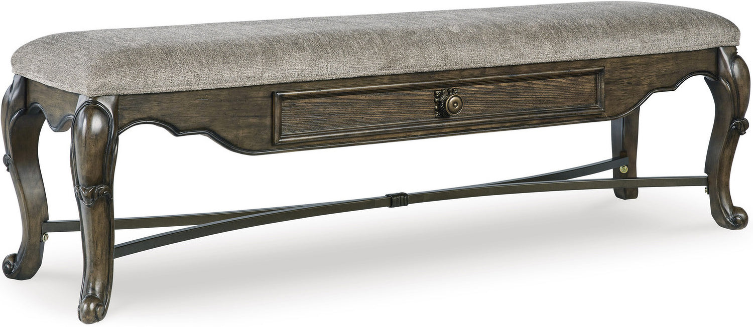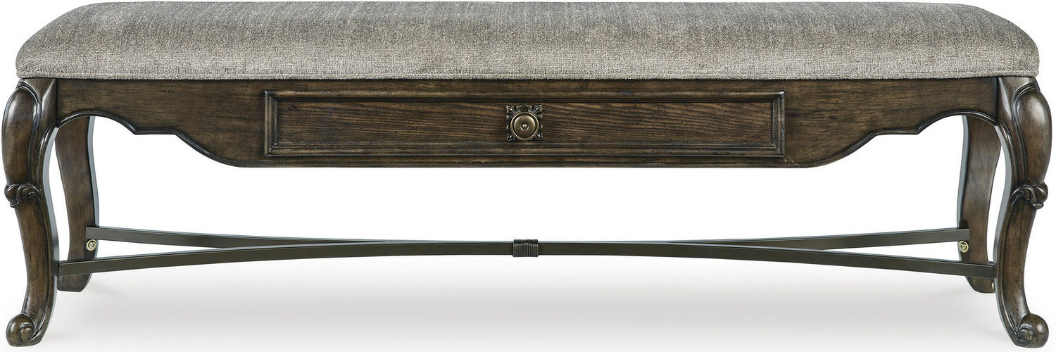 - Bench features foam cushioned seat with polyester upholstery, smooth gliding drawer with fully finished interior, ornate cabriole legs and metal stretcher bar