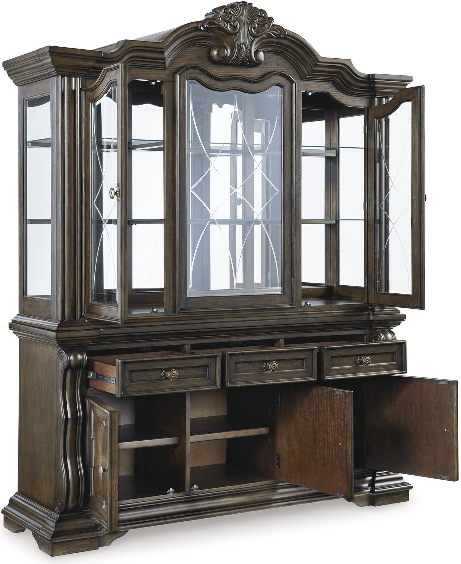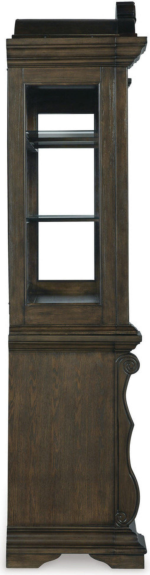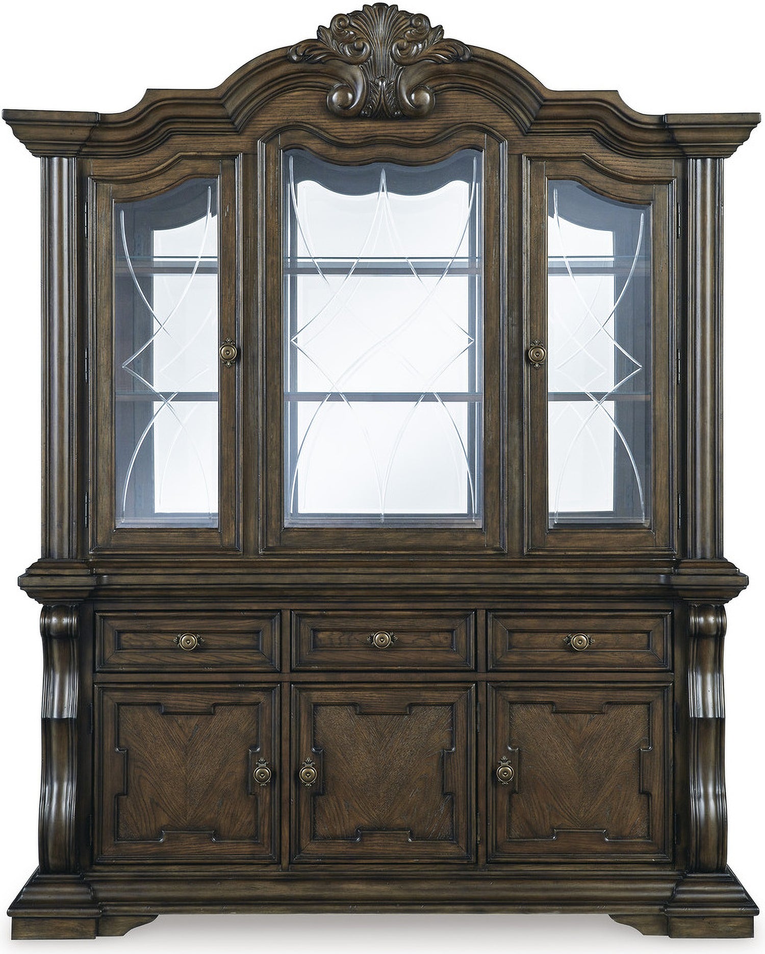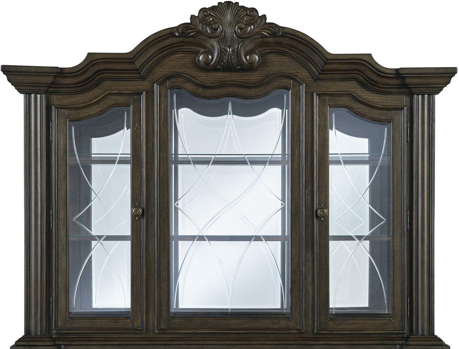 - Hutch features cabinet doors with beveled glass windows, mirrored glass interior, 2 clear glass shelves and LED display lighting