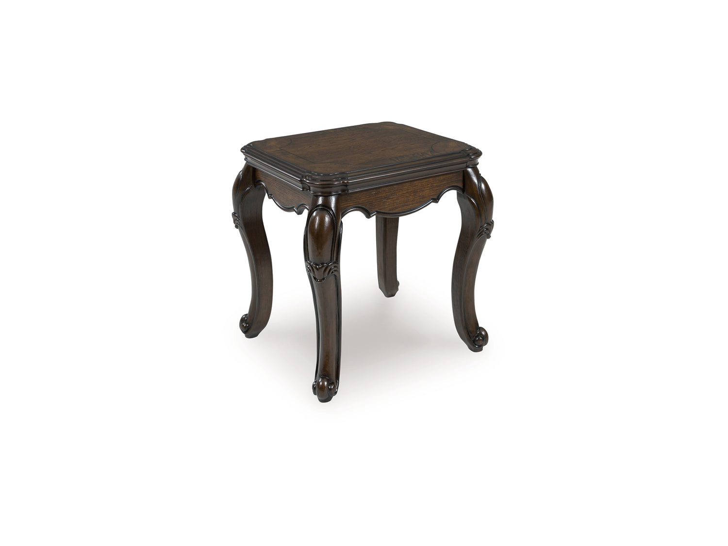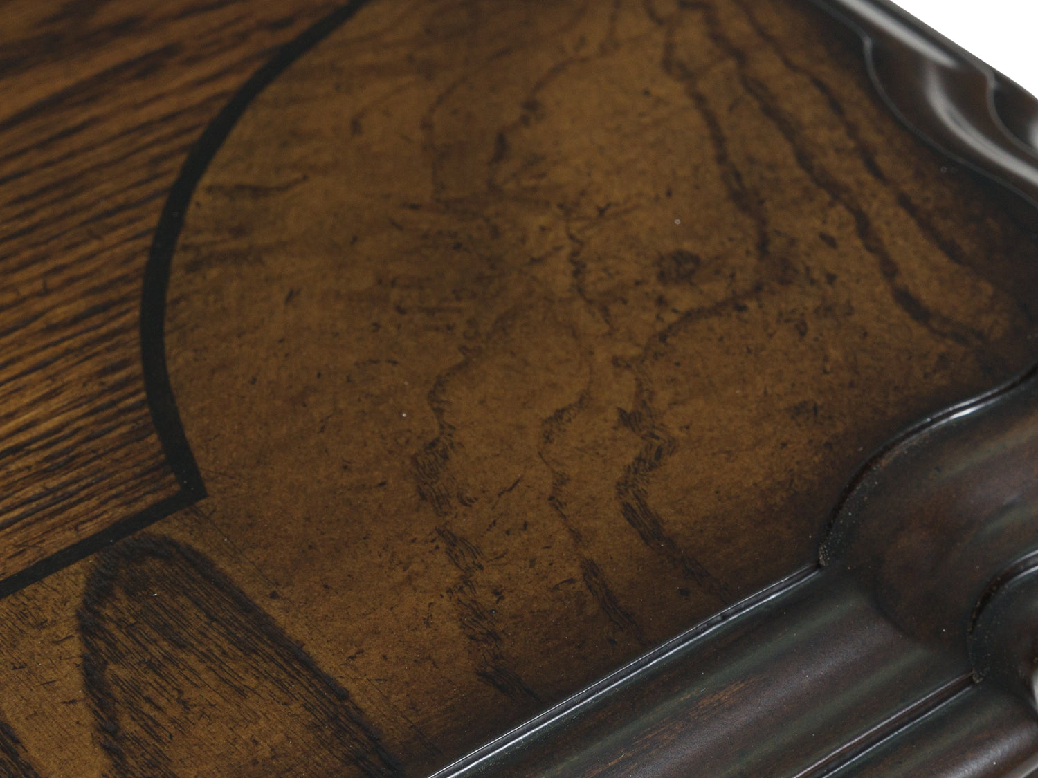 Series Features: Opulent traditional styling. Made with hardwood solids, Oak and Ash swirl veneers with MDF substrates and cast resin components. Finished in a dark brown coloration. Tables include an Ash swirl border and dark Walnut inlay tops and cabriole legs. Sofa table features a decorative metal stretcher.