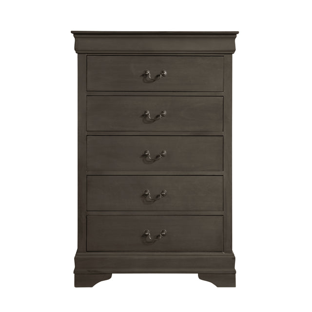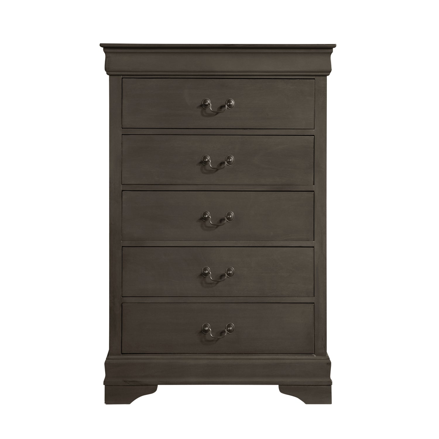The beautiful mayville collection derives its design cues from the timeless louis philippe fashion, which results in a collection that is both classic and understated in its appearance. the chest features an okume veneer that is complemented with a stained gray finish. it also features drop handles in an antique brass tone for added flair.