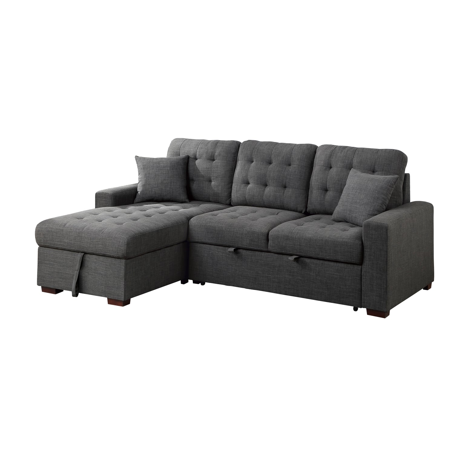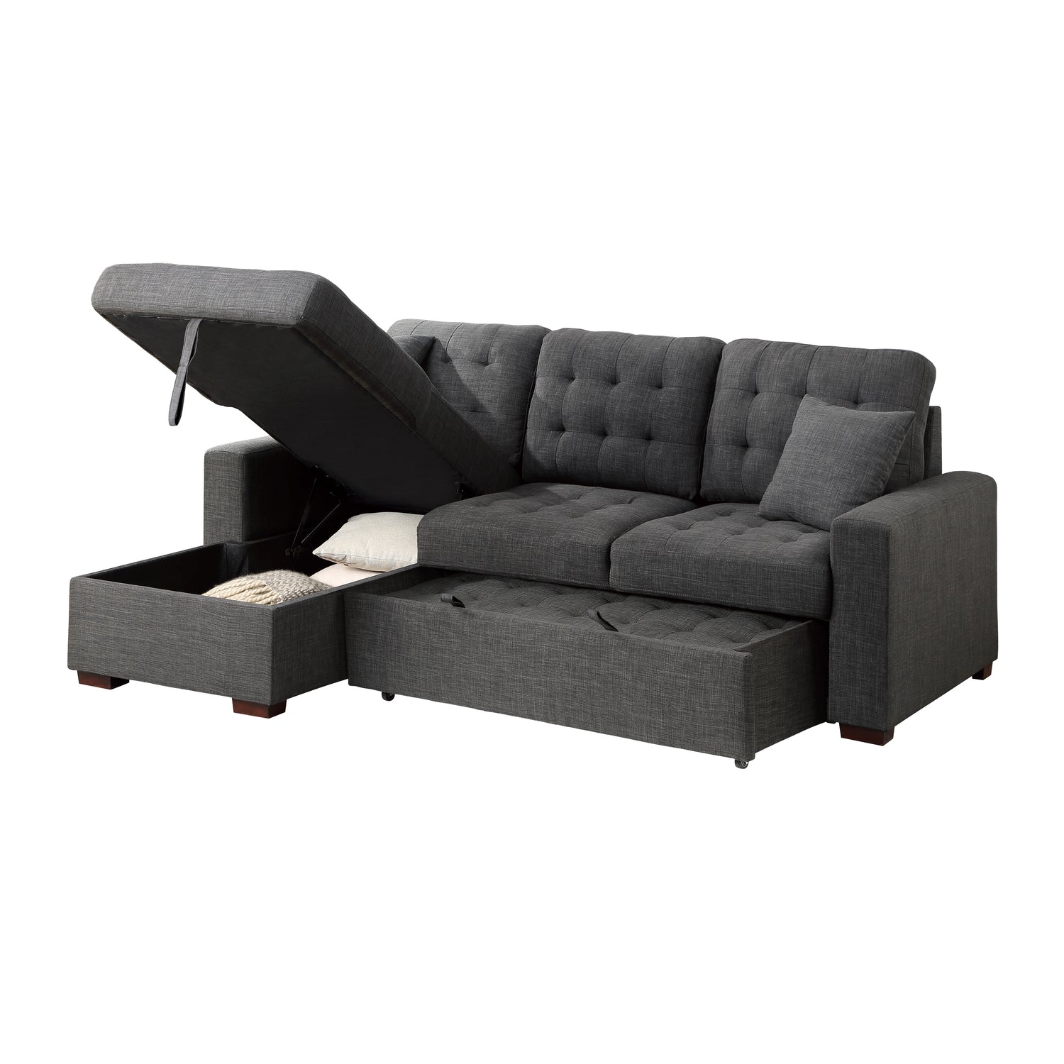 The versatility and functionality of the McCafferty Collection goes beyond that of a traditional sofa. Covered in dark gray fabric, the transitional profile of this seating group is complemented by stitch tufting and track-style arms. Conveniently stored beneath the right-side two-seat unit is a pull-out trundle that rises to create a bed while the top of the attached left-side chaise opens to reveal under-seat storage.