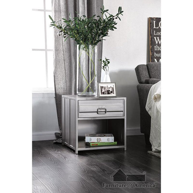Inspire a bedroom decor wreathed in the designs of the steam age. A full metal constructed night stand features a corrugated panel design for a minimalist, re-purposed look. Washtub style drawer pulls embrace your love for raw materials and handsome rugged designs.