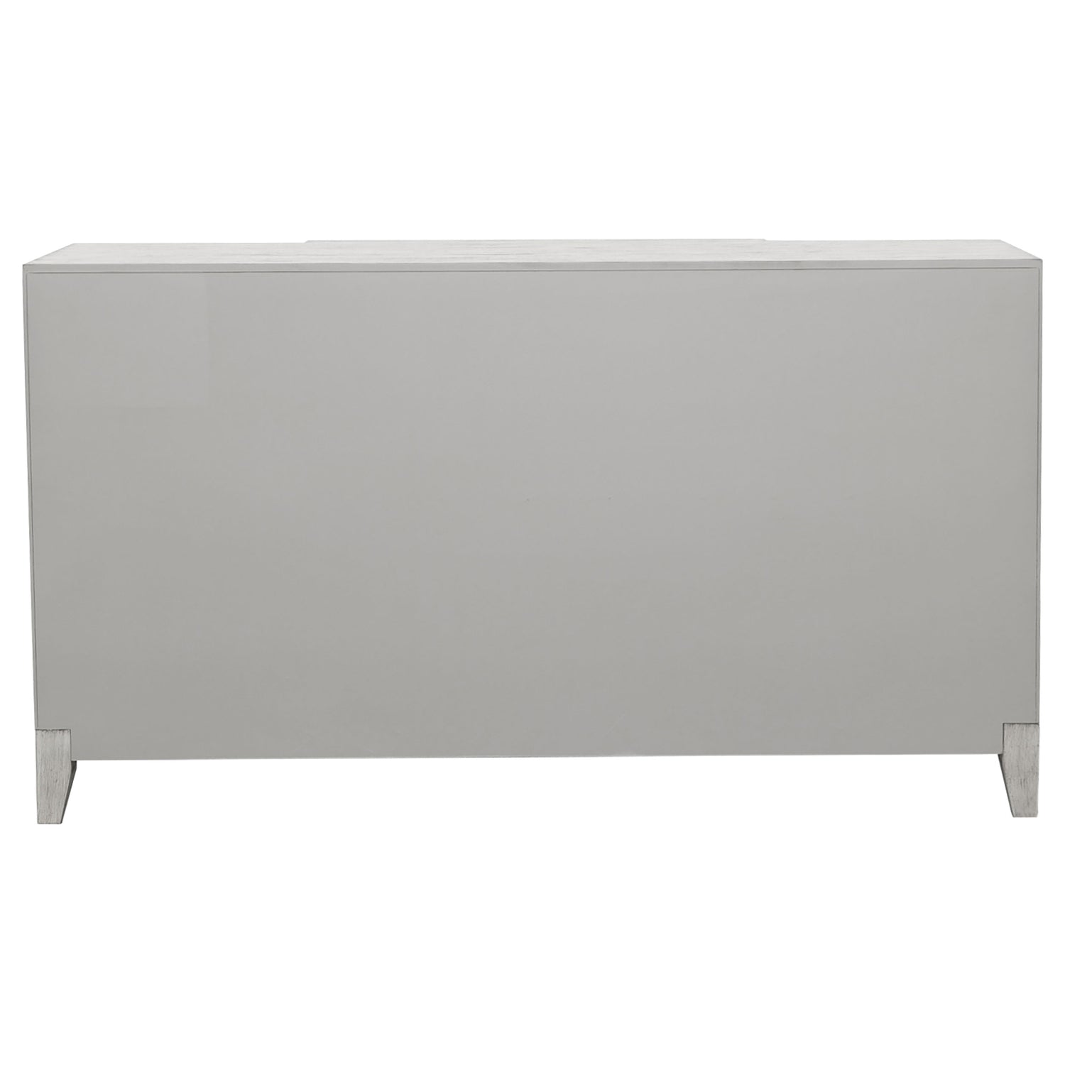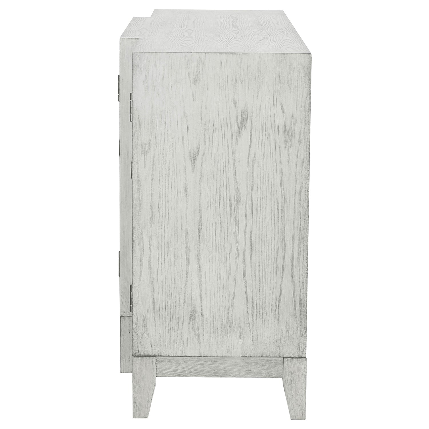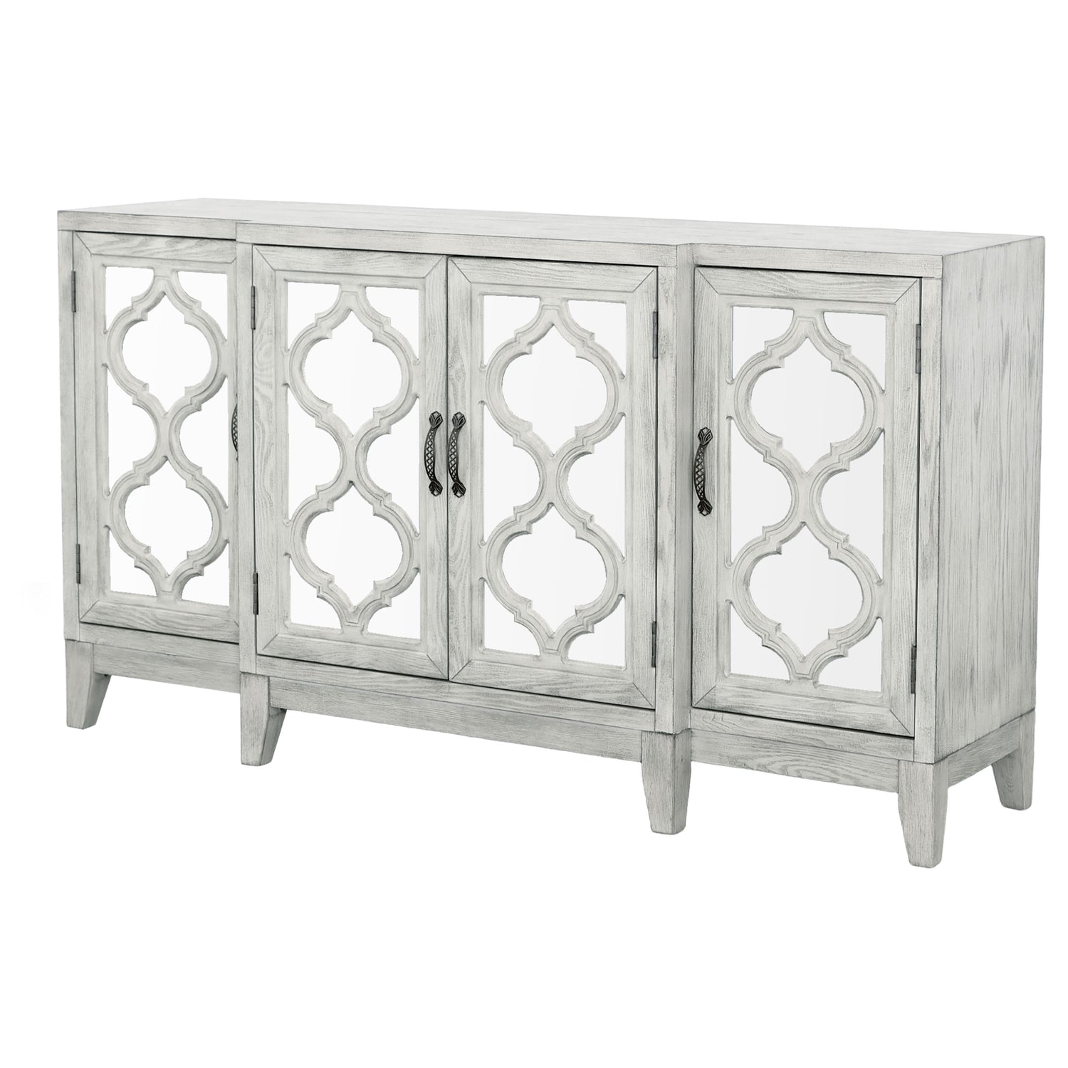 This traditional accent cabinet adds an elegant feel to your home. It's crafted in a gorgeous white finish and features tapered legs. The rectangular top is spacious enough for lamps, vases, and other decorative knickknacks. The four cabinet doors are designed with beautifully crafted lattice wooden overlay with vintage style decorative door handles in a vintage bronze finish. Doors also are inlaid with mirrored panels and open up to convenient storage shelves.