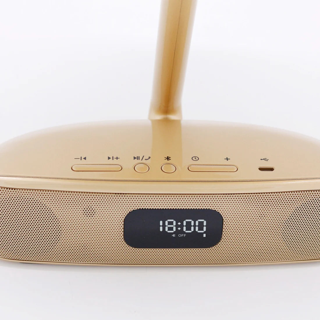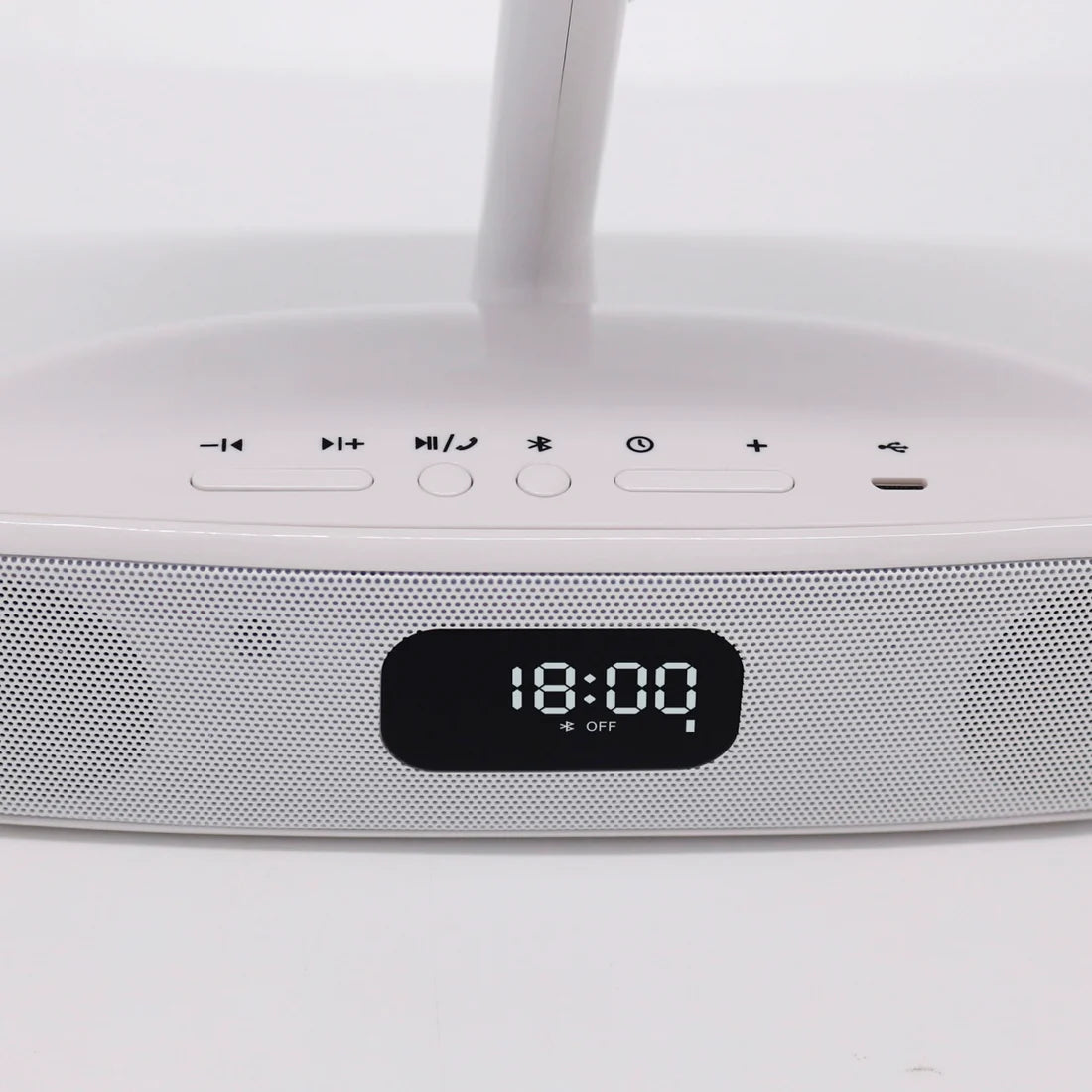 The Melody has a built-in digital display with a clock. The display also shows if your Bluetooth is on/off and the charge of your Melody out of 3 bars. When charging, the display shows “USB” and the battery bars will be flashing. When your Melody is low on battery, a single bar will be flashing.
