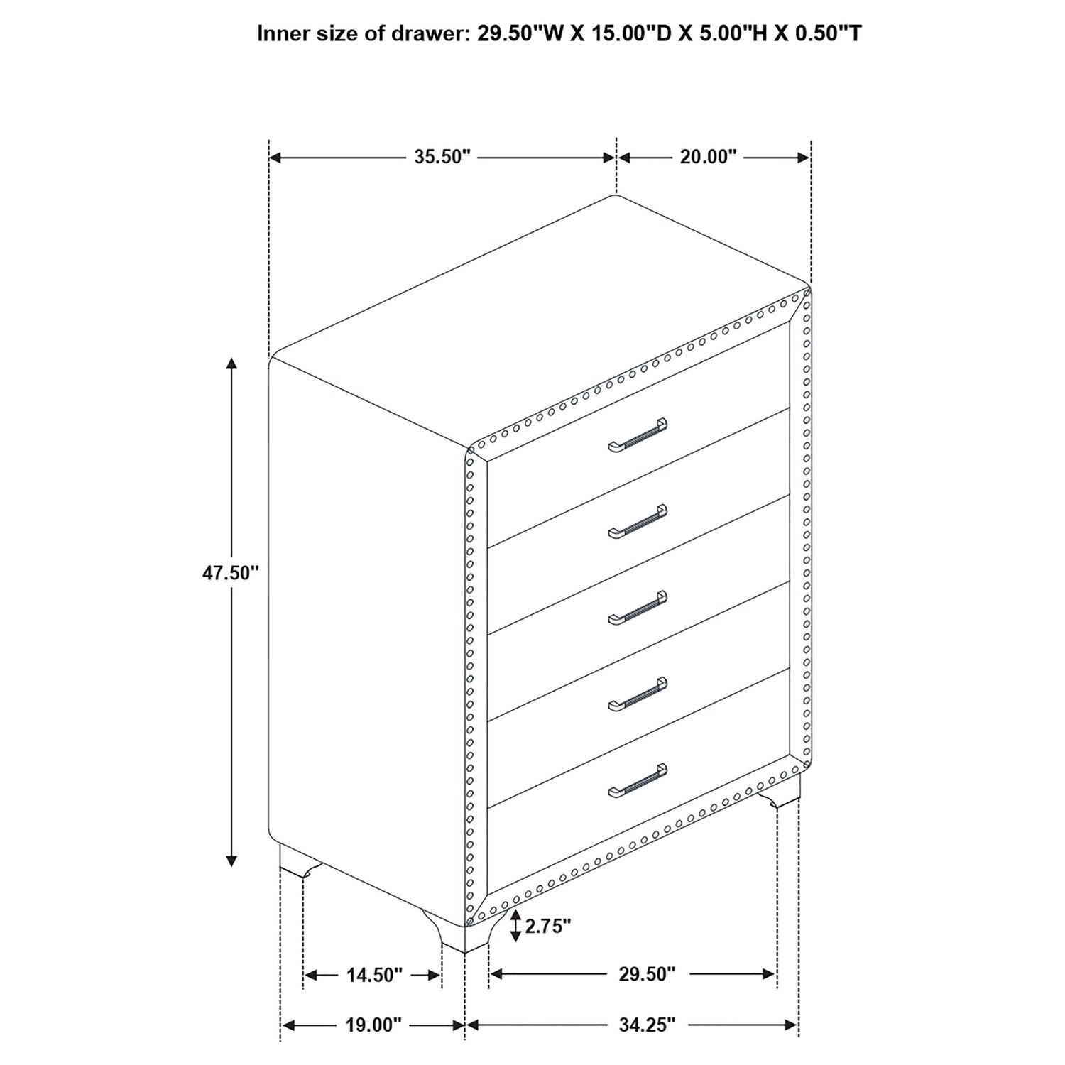 Accent your sleeping space like never before with this five-piece bedroom set. A dramatically large wingback headboard towers over the bed to make a grand display, featuring button tufting and nail head trim. A matching dresser comes equipped with six spacious drawers with nail head trim around the frame, coordinating with the matching mirror and five-drawer chest. The two-drawer nightstand is a must-have for storing bedside essentials. All pieces are upholstered in a luxurious velvet fabric.
