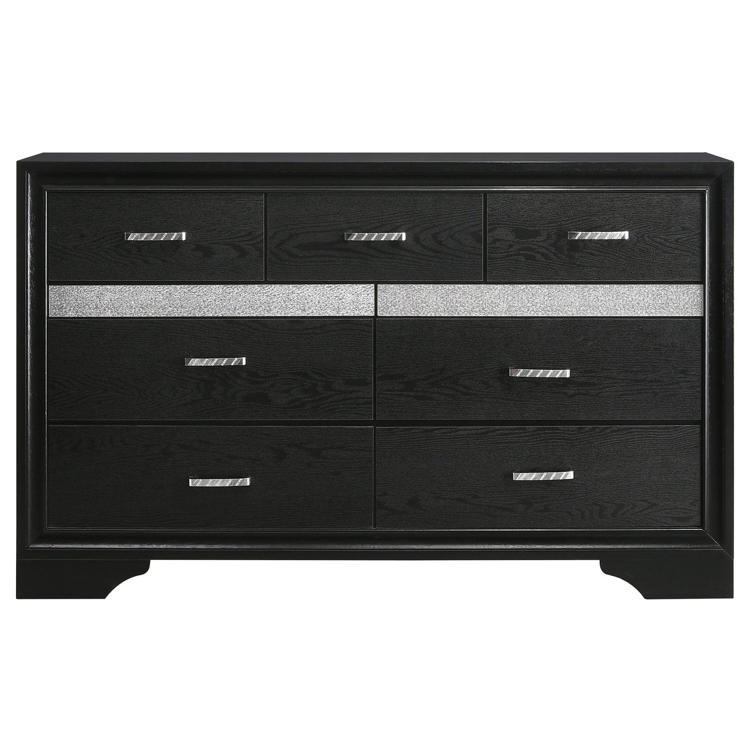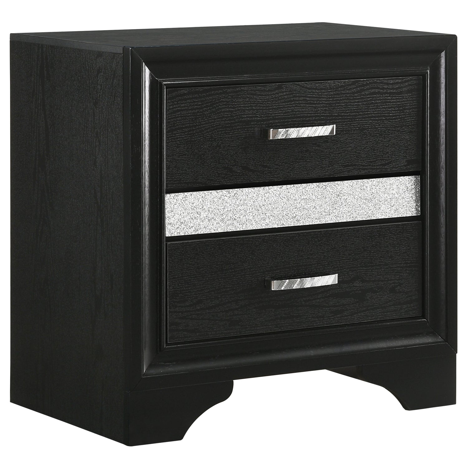 Create a stunning bedroom ensemble that's fit for modern royalty. Each gorgeous piece in this four-piece set flaunts silvery, sparkling accents for a truly glamorous look. The bed features a solid, straight silhouette and two storage drawers built into the base. The case pieces bring you even more storage space to keep your room looking neat and tidy. Available in a variety of colors and sizes, there's an option to bring any bedroom to life.