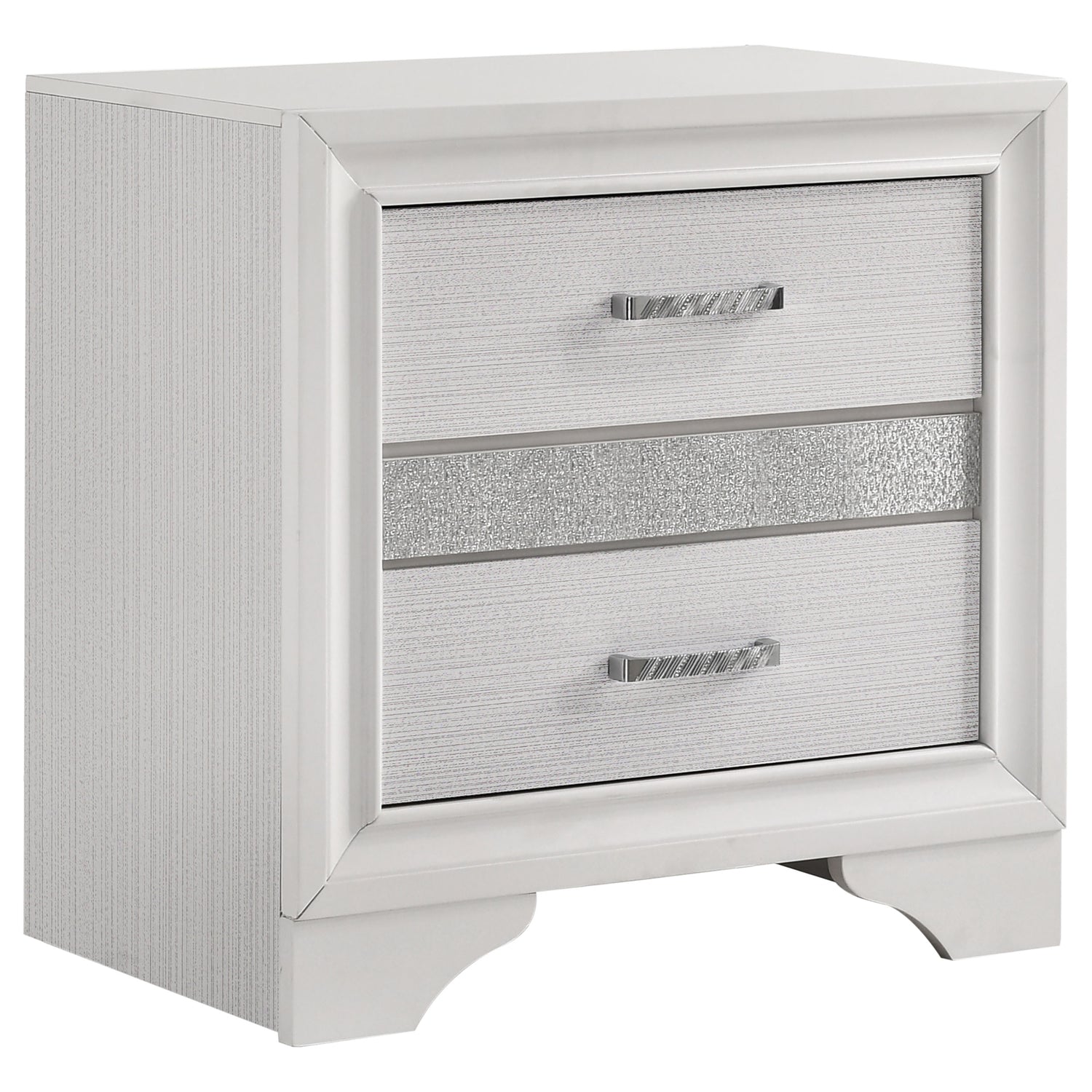 Sparkling diamond-like trim ups the glamour for a five-piece modern bedroom set. Compelling in its elegant simplicity, it centers on an upholstered bed and features a lightly textured white finish paired with smooth white molded trim. A nightstand, dresser with mirror, and chest provide plenty of drawers for easy storage and organization. Stripes of glittering, diamond-like trim and jewel-like bar pulls elevate the set, creating a fresh, sophisticated look and feel for your bedroom. Bracket feet complete the look with a touch of movement.
