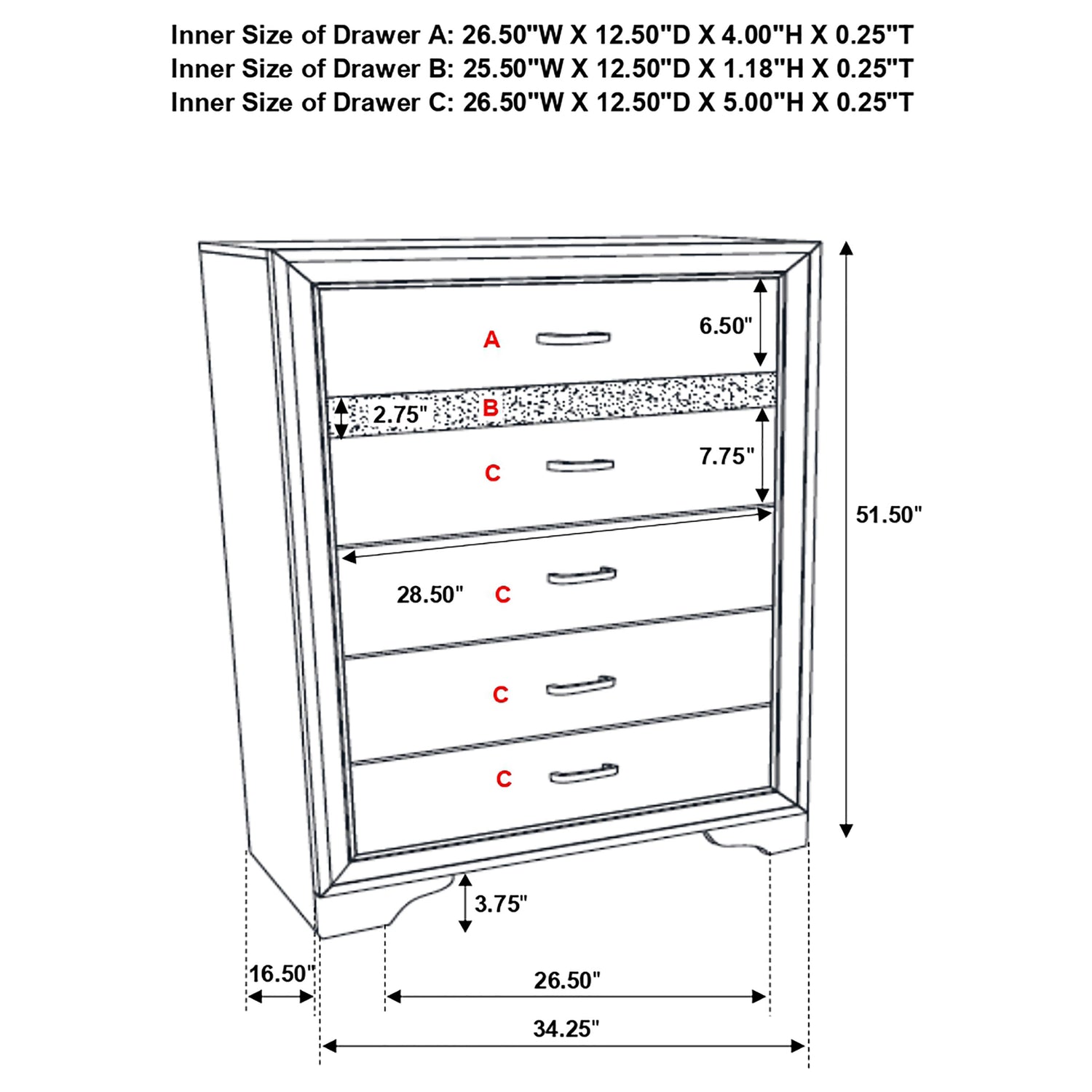 Sparkling diamond-like trim ups the glamour for a five-piece modern bedroom set. Compelling in its elegant simplicity, it centers on an upholstered bed and features a lightly textured white finish paired with smooth white molded trim. A nightstand, dresser with mirror, and chest provide plenty of drawers for easy storage and organization. Stripes of glittering, diamond-like trim and jewel-like bar pulls elevate the set, creating a fresh, sophisticated look and feel for your bedroom. Bracket feet complete the look with a touch of movement.