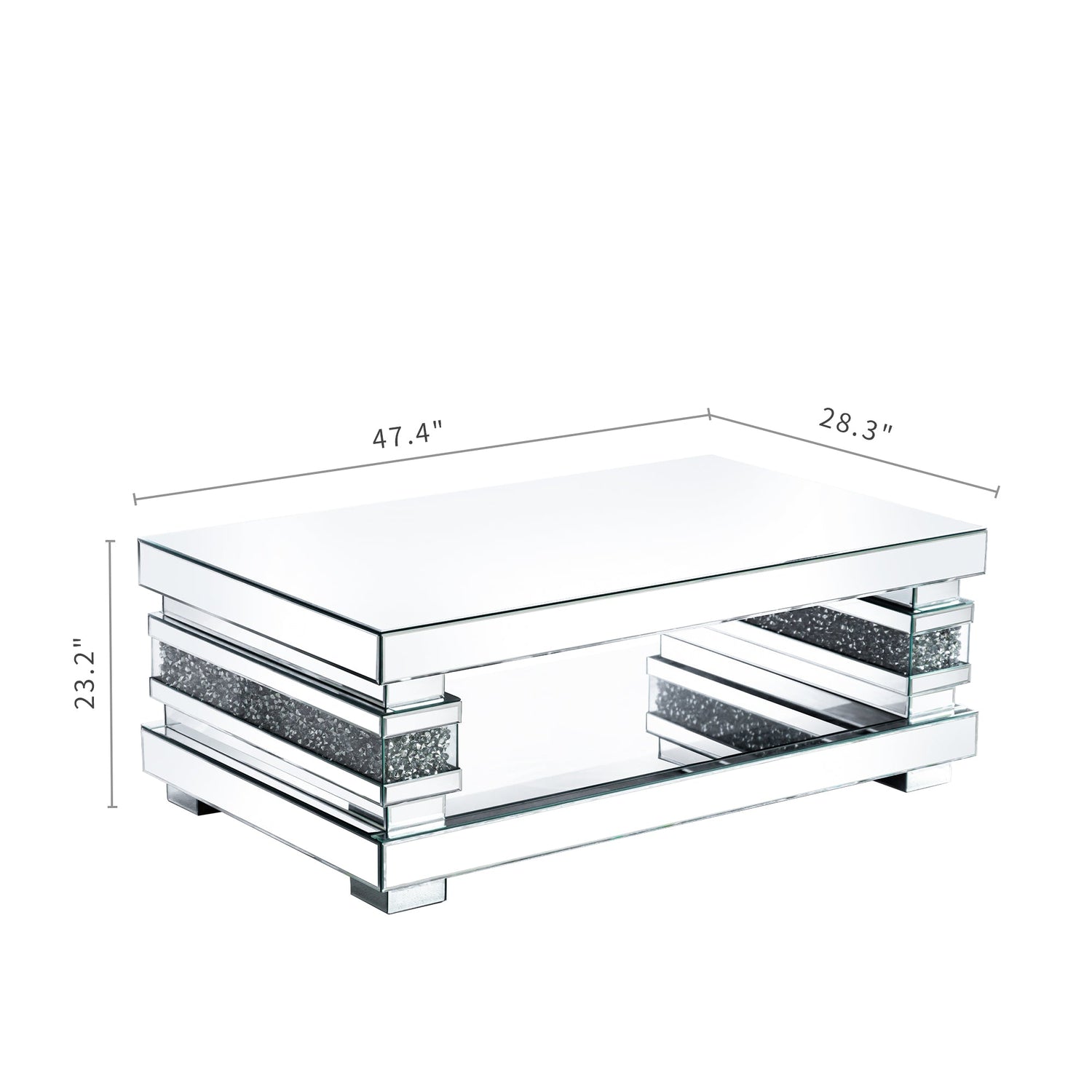 Elevate your living space with the VANITII Mirrored Coffee Table – where modern sophistication meets functional elegance. This stunning centerpiece features a sleek mirrored surface that reflects light beautifully, instantly brightening and enlarging your room's aesthetic. With generous dimensions of 47.4" L x 28.3" W x 17.9" H, it offers ample surface space for drinks, books, or decor while maintaining a refined, low-profile silhouette.