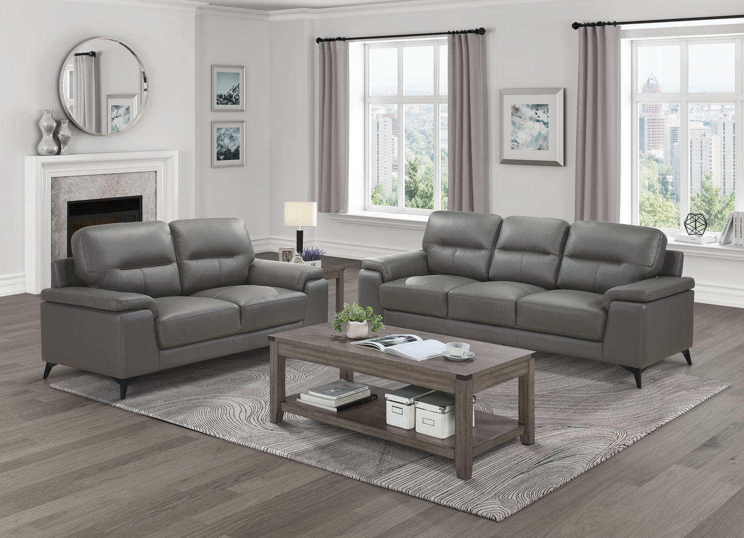 The leather's opulent smell and the soft seating's cozy feel come together in the sofa from the mischa collection, which is designed for contemporary living spaces. the cover, which is made of dark gray top grain leather and imitation leather, contributes to the collection's already streamlined appearance. arms with a contoured pillow-top and legs made of black metal both contribute to the current appearance of the stance. along with the love seat and chair that go with it, you also have the option of selecting a cover made of top grain silver leather with a faux leather match.