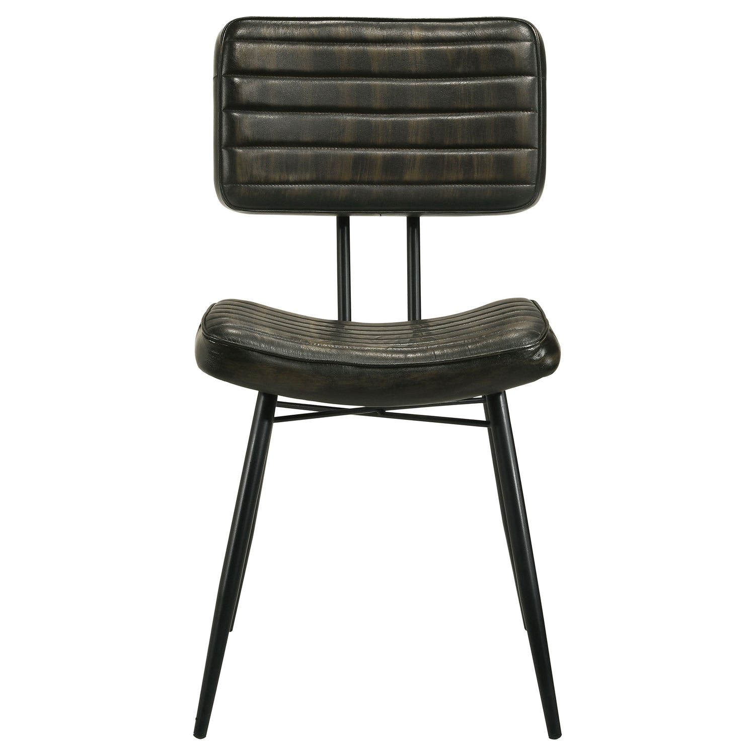 Description: Retro charm with Mid-Century Modern attitude in a seven-piece casual dining set featuring a rectangular wood and iron dining table with tilted open leg braces and six side chairs with iconic metal framing and channeled tufting upholstery
