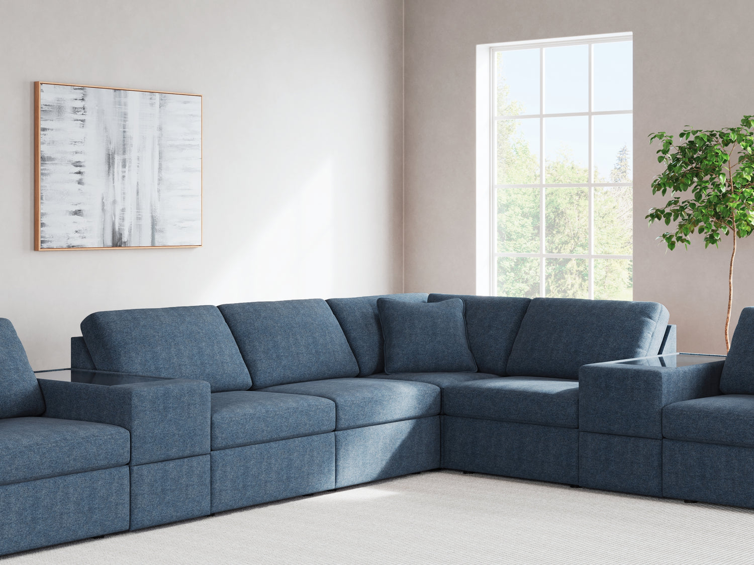 Series Features: "Modmax" a true customizable modular sectional to fit any space. Featuring the Next-Gen Nuvella true performance fabric that offers high UV protection while being bleachable as well as cleanable. This is excellent for a high traffic areas. Loose reversible cushions, loose reversible back cushions with non-skid legs. All sides are completed (no connectors) so each piece can float anywhere in a room. Removable seat cushions, backs, and accent pillows with washable zippers for machine washing. One of the consoles are offered with bluetooth and audio sound system with pull out storage drawer and plexiglass top. The other is a console with pull out storage drawer and plexiglass top.