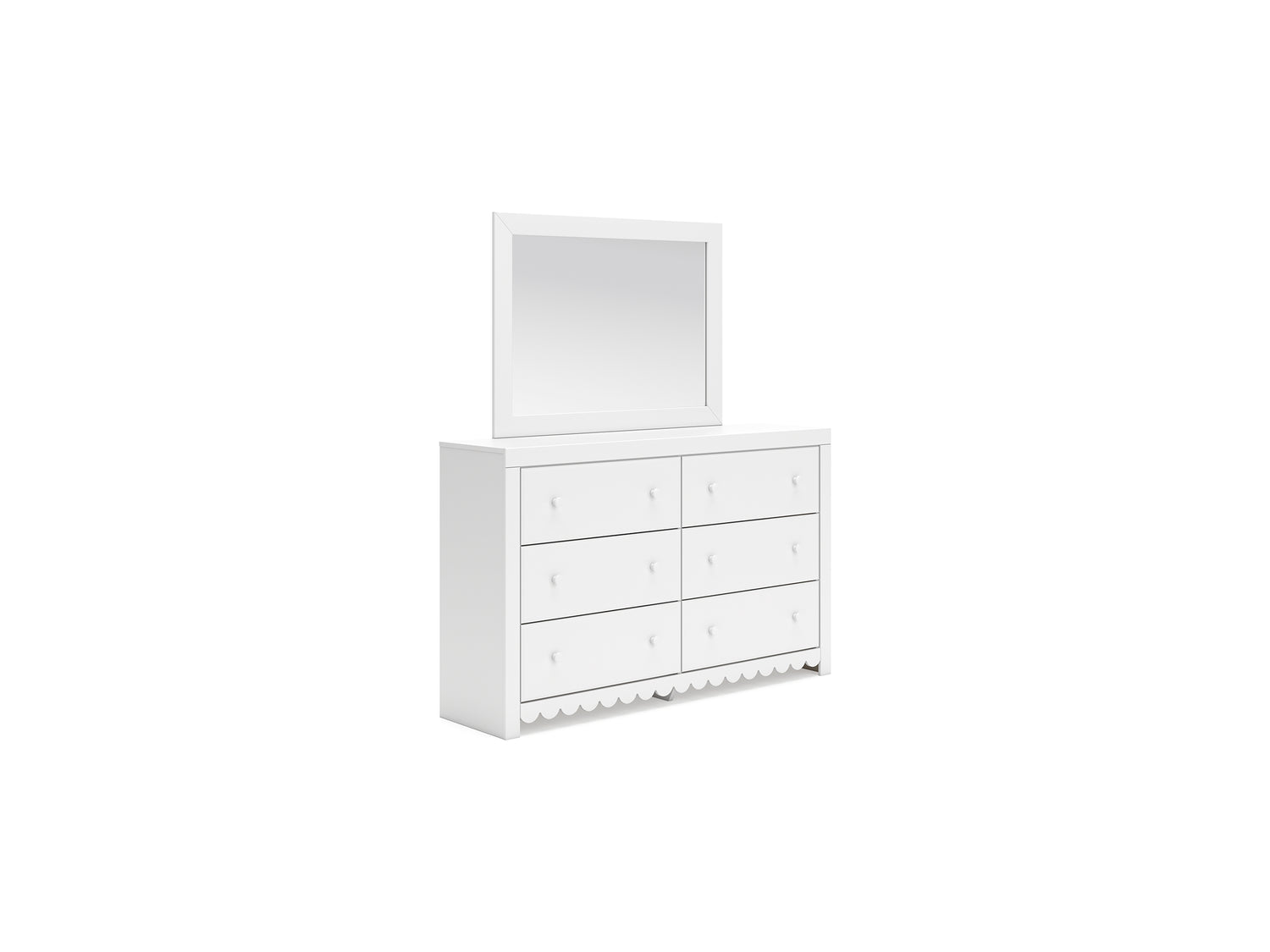Series Features: Matte white finish. Cases feature a framed front and pilasters. Bed and cases feature a playful scallop design. Cases accented with simple white knobs. Beds feature decorative ball tops. Side roller glides for smooth operating drawers. Drawer interiors finished with a replicated linen design. A slim USB charger is located on the back of the nightstand tops. Mirror (36) has the versatility to mount to on the dresser or to the wall both horizontally and vertically. Twin (53) and full (87) headboards can attach to a hook-on metal bed frame B100-21 respectively. All storage footboards (52S,84S) require rails (83,86) respectively. Headboards (53,87) are compatible with all footboard options (52,52S,84,84S) respectively. Mirror (36) has the versatility to be mounted on dresser or wall horizontally or vertically. Safety is a top priority, clothing storage units are designed to meet the most current standard for stability, ASTM F 2057 (ASTM International). Drawers extend out to accommodate maximum access to drawer interior while maintaining safety. Minor assembly required.