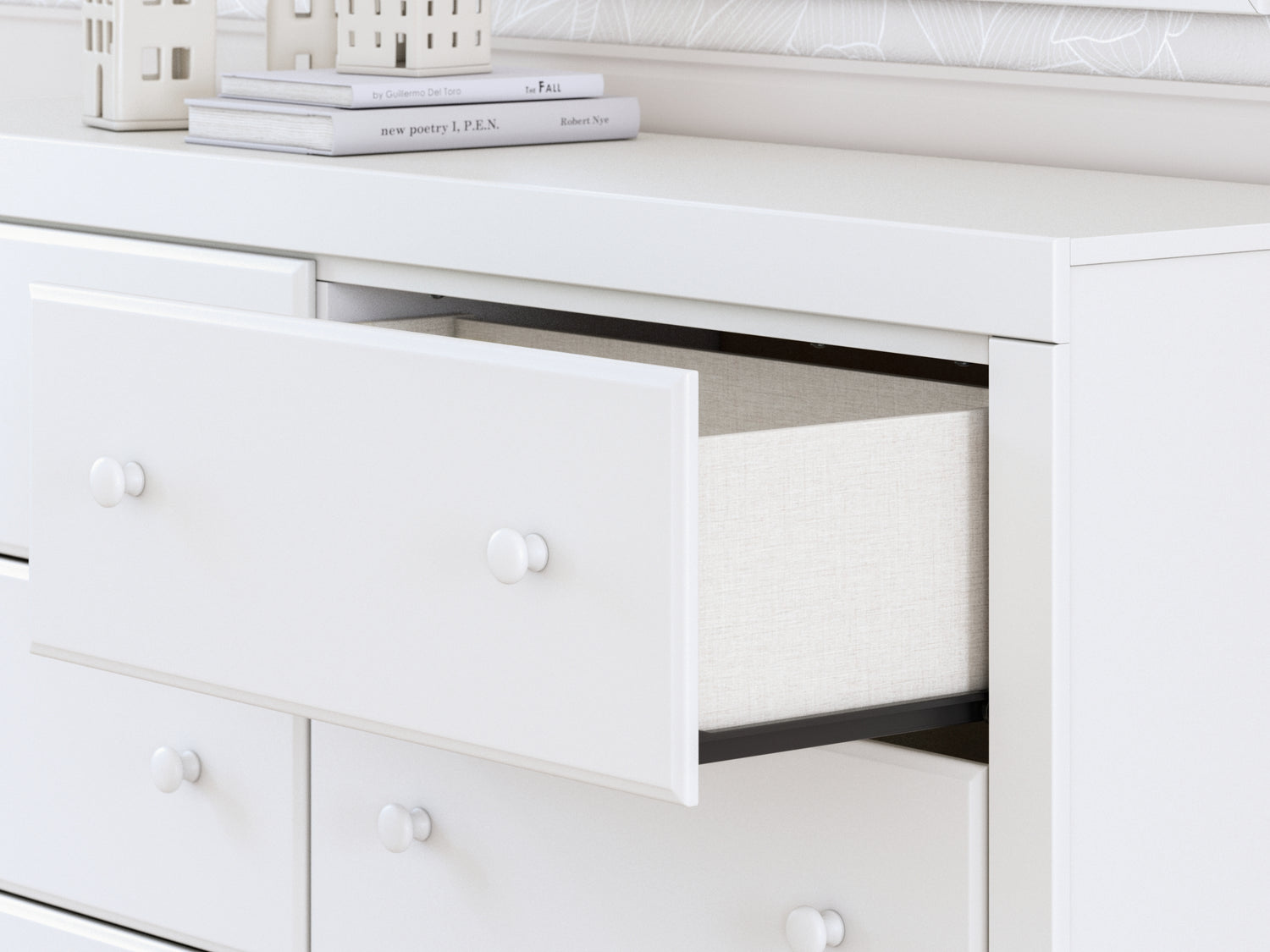 Series Features: Matte white finish. Cases feature a framed front and pilasters. Bed and cases feature a playful scallop design. Cases accented with simple white knobs. Beds feature decorative ball tops. Side roller glides for smooth operating drawers. Drawer interiors finished with a replicated linen design. A slim USB charger is located on the back of the nightstand tops. Mirror (36) has the versatility to mount to on the dresser or to the wall both horizontally and vertically. Twin (53) and full (87) headboards can attach to a hook-on metal bed frame B100-21 respectively. All storage footboards (52S,84S) require rails (83,86) respectively. Headboards (53,87) are compatible with all footboard options (52,52S,84,84S) respectively. Mirror (36) has the versatility to be mounted on dresser or wall horizontally or vertically. Safety is a top priority, clothing storage units are designed to meet the most current standard for stability, ASTM F 2057 (ASTM International). Drawers extend out to accommodate maximum access to drawer interior while maintaining safety. Minor assembly required.