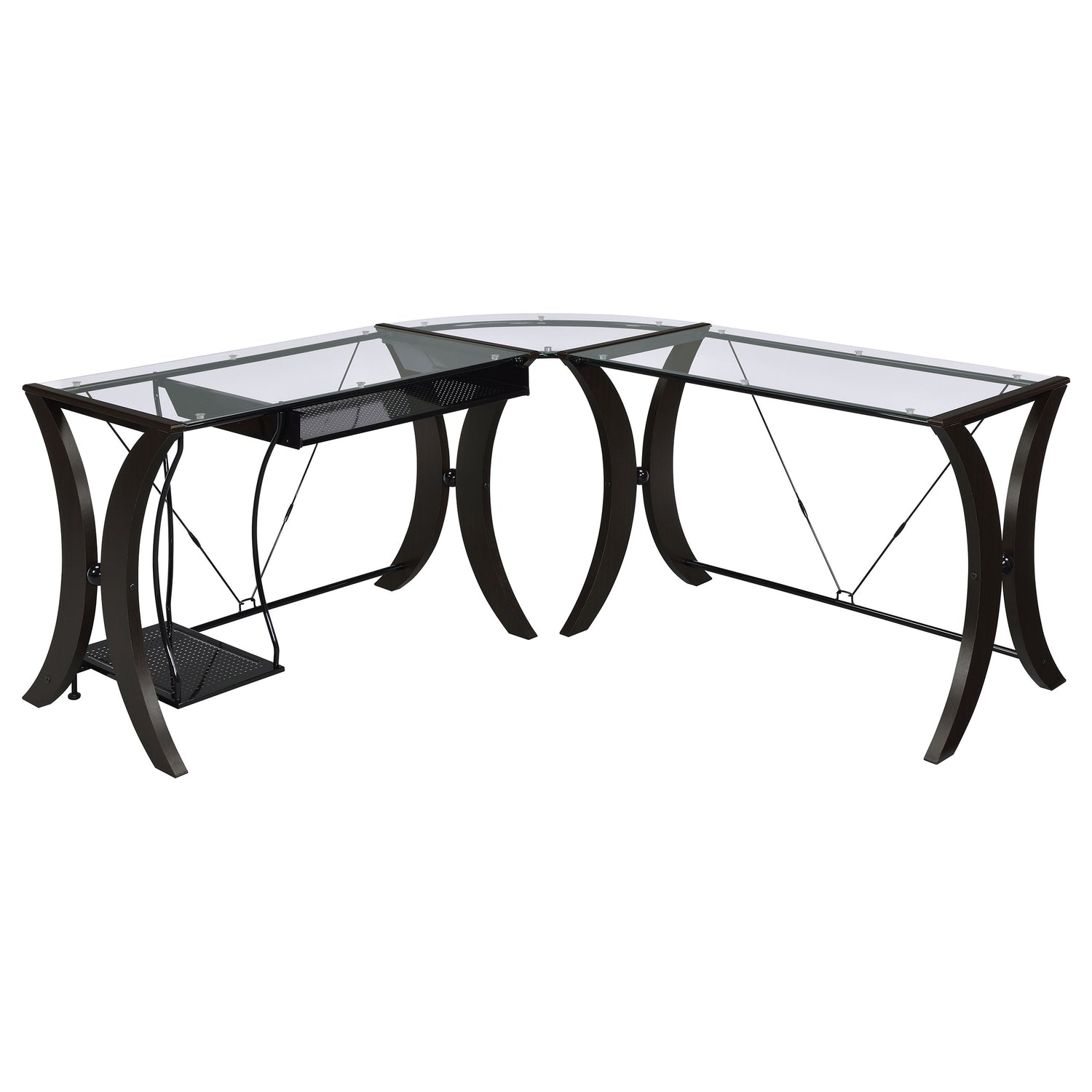 This contemporary, three-piece computer desk is an effortless blend of glamour and functionality. Its base is composed of gracefully curved metal lines for a smooth, sleek silhouette. Finished in gorgeous shades of cappuccino and glossy black, it boasts a truly elegant look. A clear tempered glass top adds a pleasing touch of shine. This desk features a built-in CPU stand and keyboard drawer for your convenience.