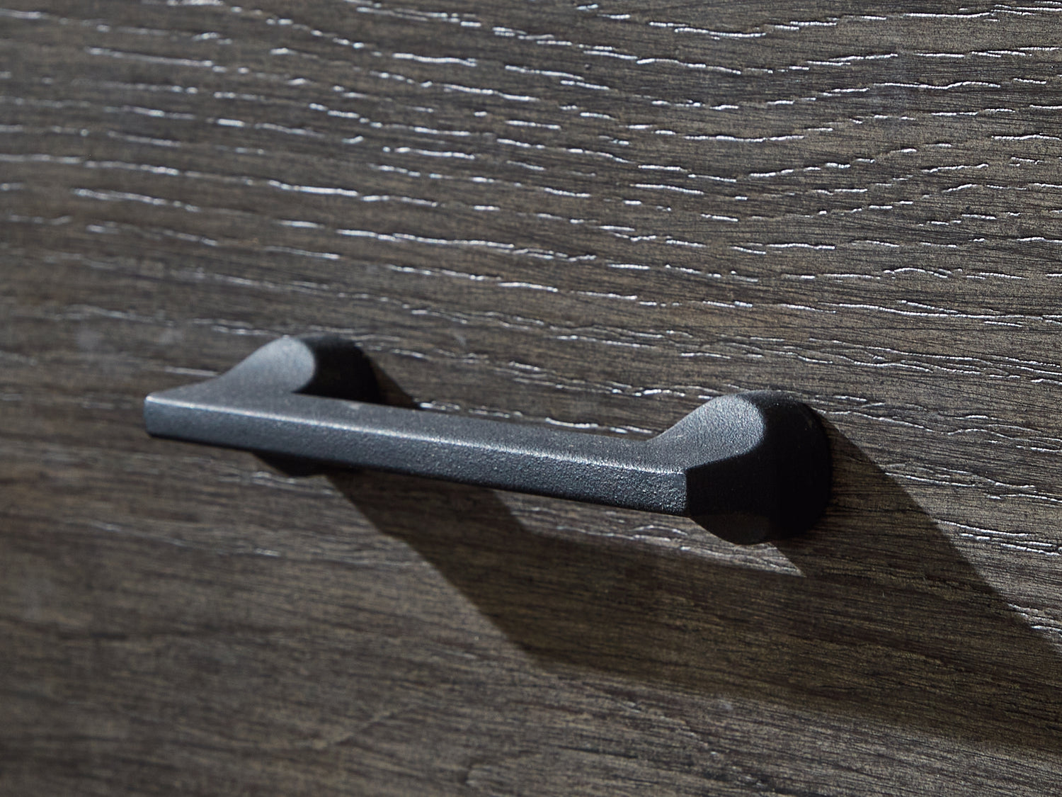 Series Features: Casual contemporary design. Made with hardwood solids, and MDF substrates with an embossed wood grain texture. Medium grayish brown finish with a blackened wood grain contrast. Cases feature spacious inset drawers with fully finished interiors, metal ball-bearing side glides and metal bar pulls with a matt black finish. Top drawers have black felt bottoms. The stylish panel bed features a lay-back headboard with decorative inset metal grill. The two drawer nightstand includes a 110V power supply with dual USB charging ports.
