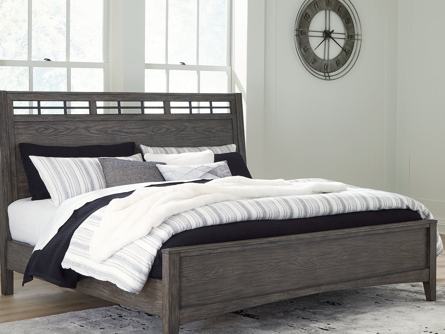 Montillan Grayish Brown King Panel Bed is backordered and will ship as soon as it is back in stock.
