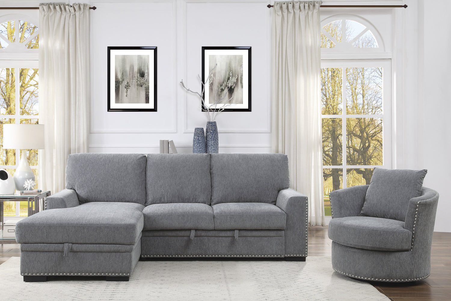 The morelia collection's usefulness exceeds that of a conventional sofa, making it the ideal piece to add to your living room if you like a more laid-back aesthetic. this seating group's contemporary appearance is emphasized by the use of loose back cushions and track-style arms, both of which are covered in chenille in a gray color. a pull-out trundle can be found neatly tucked away beneath the sofa, and when it is raised, it may be used as a bed. additionally, the top of the linked chaise can be opened to reveal storage space beneath the seat. the chaise and the paired two-seater can be placed on either the right or the left side of the room, depending on the requirements of the available area.