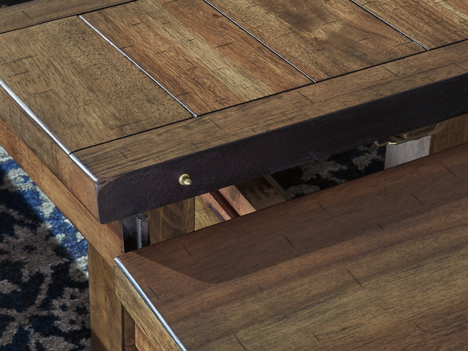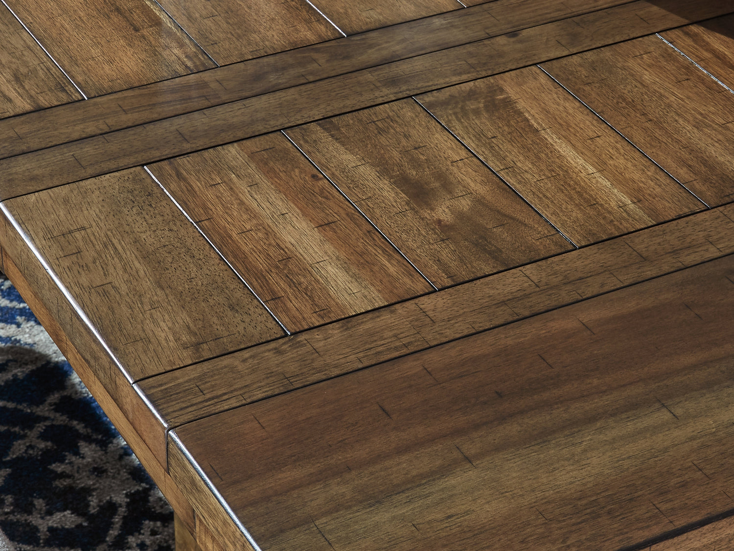 Series Features: Made with Rubberwood solids and Acacia veneers. Casual rustic design with planked effect on table top. Table extends to fit 8 with two end leaves. Alternate seating available with the cushioned bench. Matching server offers plenty of storage options. Collection is finished in a distressed nutmeg brown color.