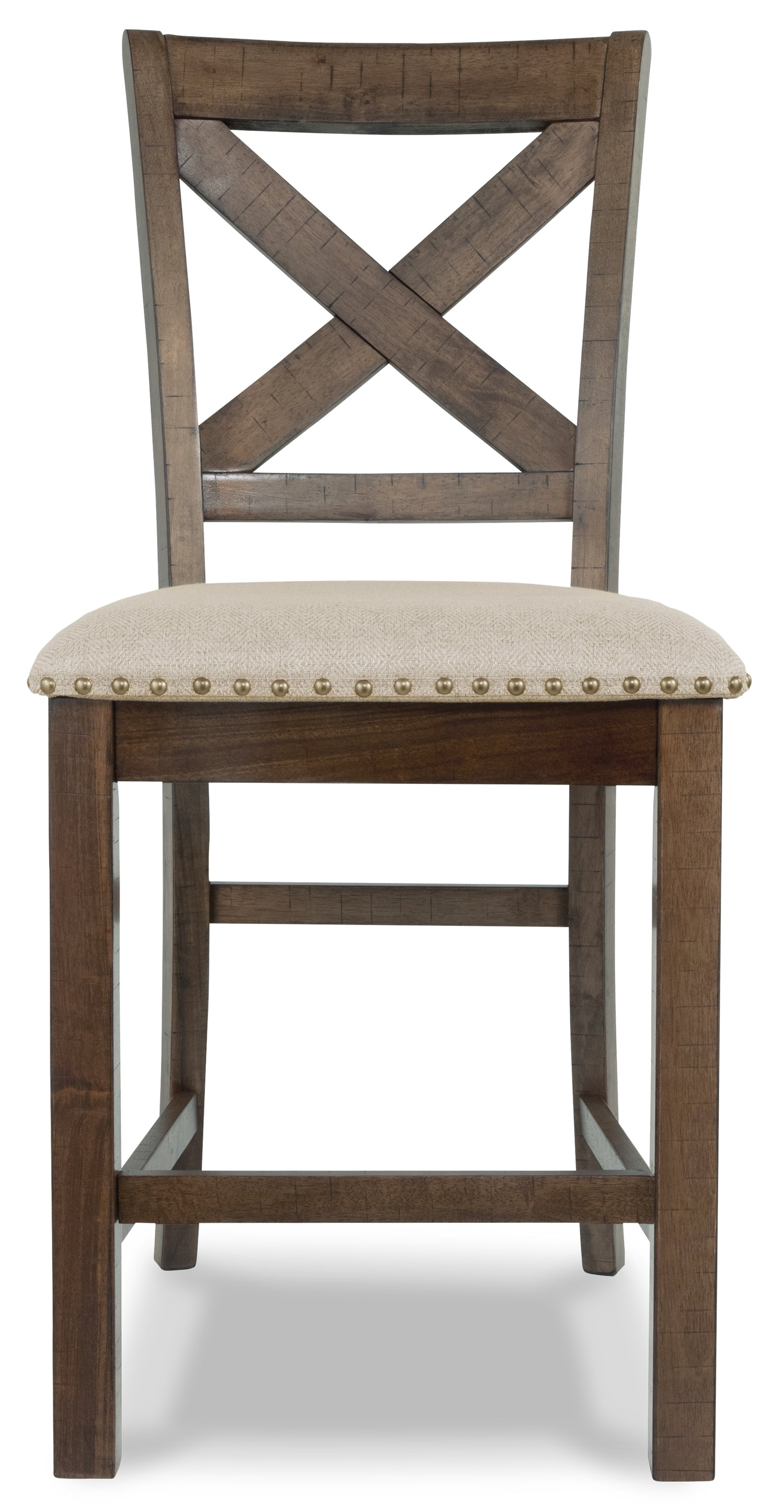 This upholstered bar stool might be simple at first sight, but a closer look reveals beauty in the details. With a distressed nutmeg finish, antiqued nailhead trim and textured polyester upholstery, its beaming with charm. Cushioned seat ensures long, lingering meals are enjoyed in comfort.