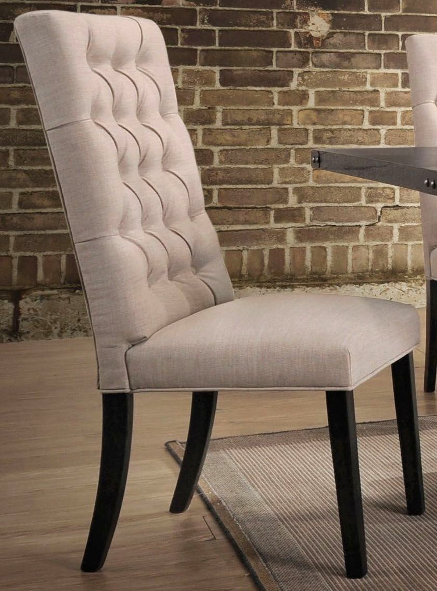 - Chair features tan linen upholstery for a comfortable seating experience