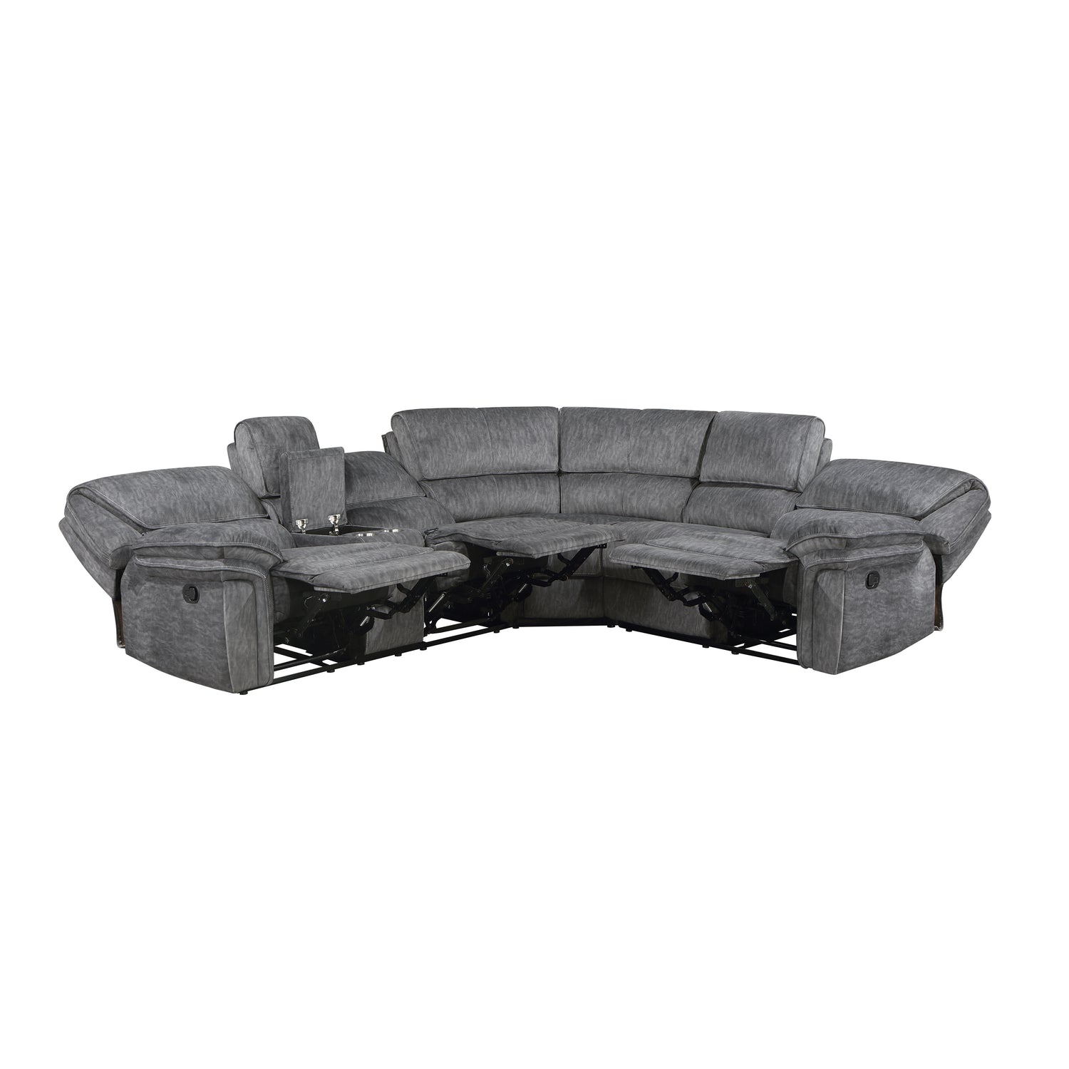With a versatile style that is perfect for your casual living room, the Muirfield Collection’s plush seating and modern aesthetic create a platform for your relaxation. The plush pillow-top arms and seating of the sectional is covered in smoke gray fabric upholstery for neutral accent to your home’s decor. The left side seating of the sectional features a center console, its cupholders and hidden storage providing functional convenience to the group. The end chairs of the sectional feature manual-motion mechanisms that are operate with the pull of a side-mounted tab, taking you from seated to reclined in an easy motion.