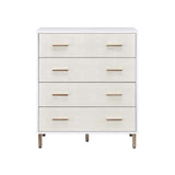 This Myles chest is a charming addition to your bedroom, with four drawers that are perfect for storing clothing and other miscellaneous items. The chest is finished in a white frame and with alluring gold hardware and legs, then accentuated by decorative drawer fronts that feature champagne faux crocodile texture.