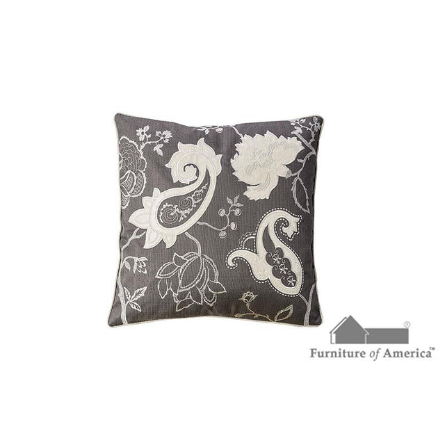 Ivory and dark gray clash beautifully in this polyester throw pillow with paisely and floral design.