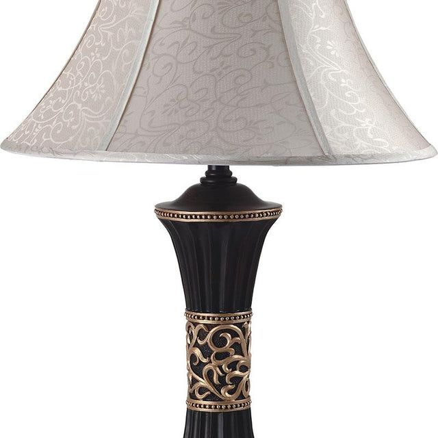 A espresso reeded body made of poly bends in the middle to accommodate unique, gold patterns all around. The ivory shade is traditional in shape and fits well in conservative spaces.