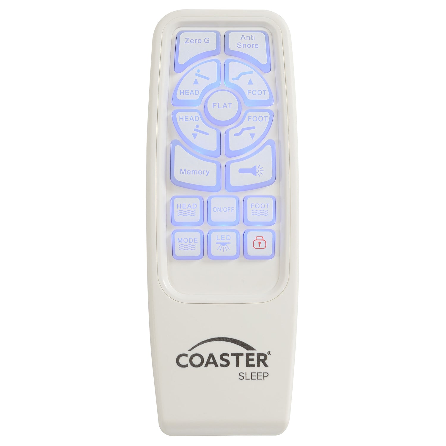 Revitalize yourself each and every night with this stunning multifunctional adjustable bed base with grey fabric trim and adjustable or removable legs. The bed base delivers the latest in modern technology with dual massage function on the head and foot of the bed, with three levels of intensity for optimal relaxation. The bed is equipped with a wireless remote that's backlit and gives full control of the height of the head and foot of the bed and includes presets for a most comfortable night's sleep. Each side of the bed is equipped with a dual USB port perfect for keeping bedside electronics charged and ready to use. You can even control the bed from your phone with Bluetooth connectivity and the Coaster app installed on your smart device.