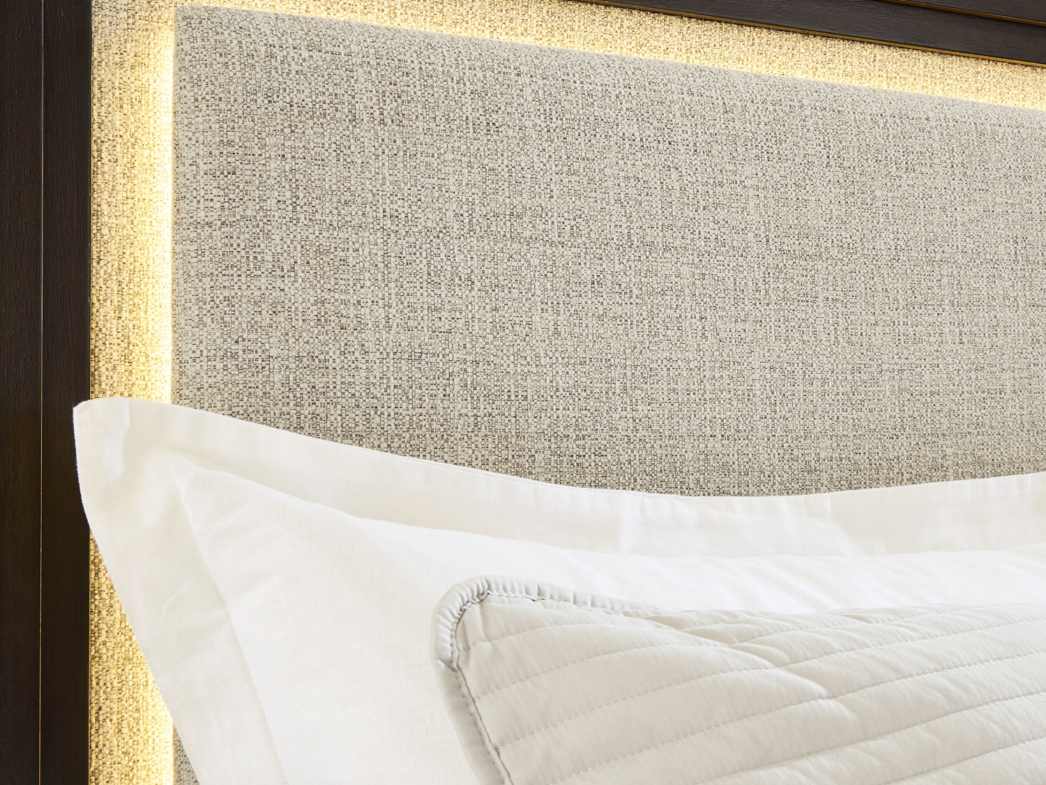 Series Features: Contemporary design. Made with hardwood solids, engineered wood and MDF substrates. Finished in trend-right grayish brown wood color. Art Deco inspired stepped moulding frame for a fresh take on classic contemporary design. Contemporary styled metal bar pulls are finished in a satin nickel color for a touch of sophistication. Drawers feature dovetail drawer construction, fully finished interiors and heavy duty ball-bearing side glides. Headboard features a floating inset upholstered panel with a light gray Next-Gen Nuvella™ performance fabric for worry free cleanability and an LED back-light. A light switch is located on each side of the headboard and includes a convenient dual USB [ USB-A and USB-C ] charging port to help keep devices charged overnight.