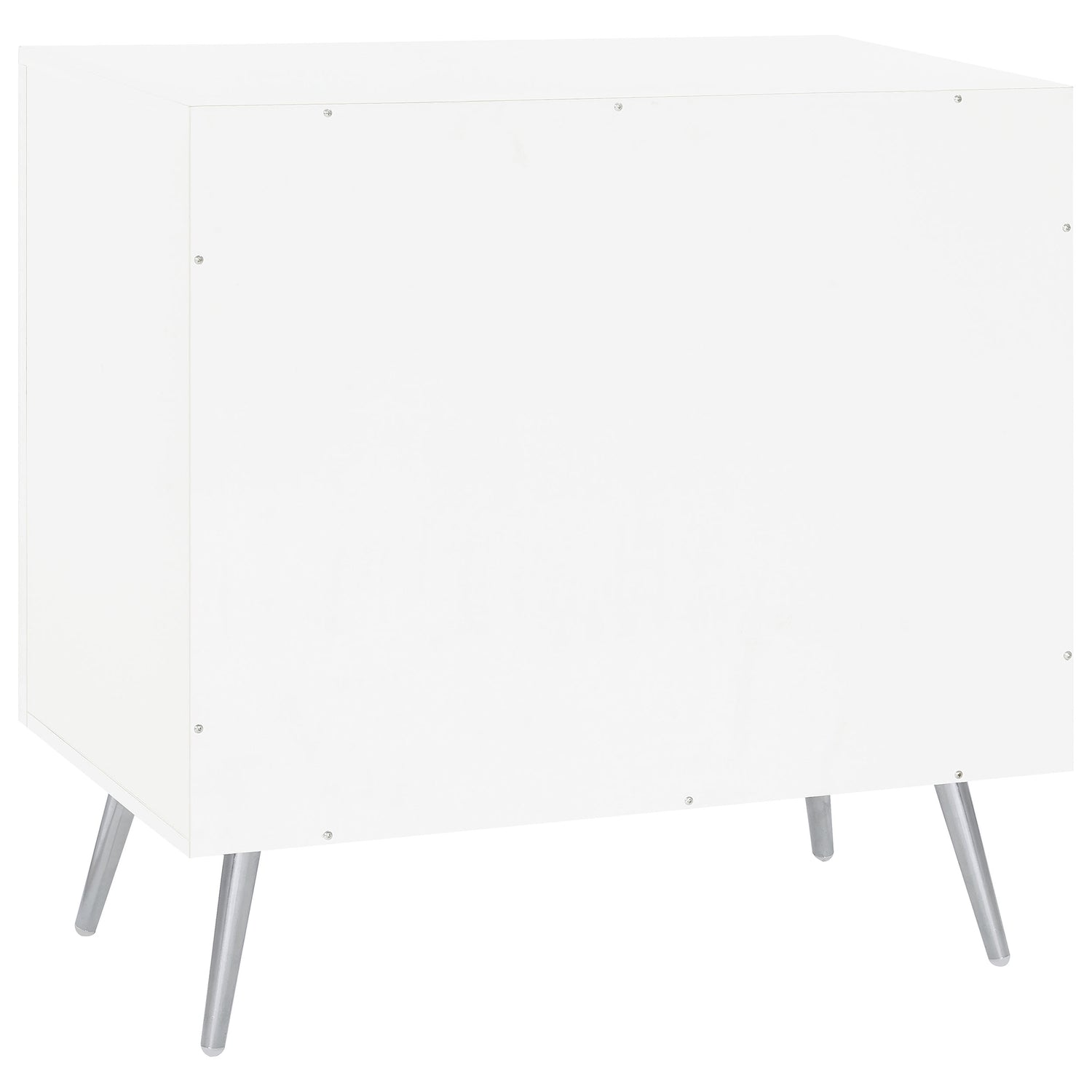 Step into a world where classic charm meets modern elegance with this 2-door accent cabinet. The crisp white finish on engineered wood construction is beautifully complemented by the textural contrast of rippled doors. Tapered steel legs, electroplated in chrome, give rise to two tiers of shelving, including a tempered glass shelf, all crowned with chic acrylic crystal knobs. This piece is not just a storage solution, but a statement that adds a touch of sophistication to any space.