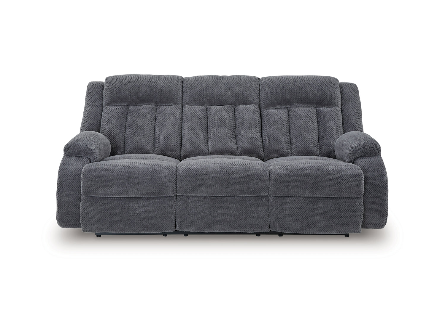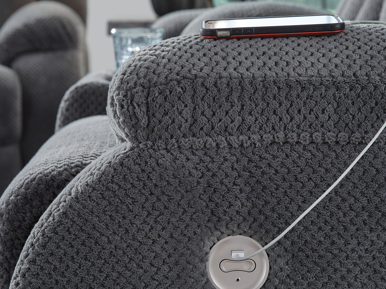 Series Features: Traditional power styling with pillow top arms and channel backs. Power Sofa with drop down table, power reclining loveseat and power recliner and USB charging port A & C. Upholstered in plush waffle weave velvet fabric.