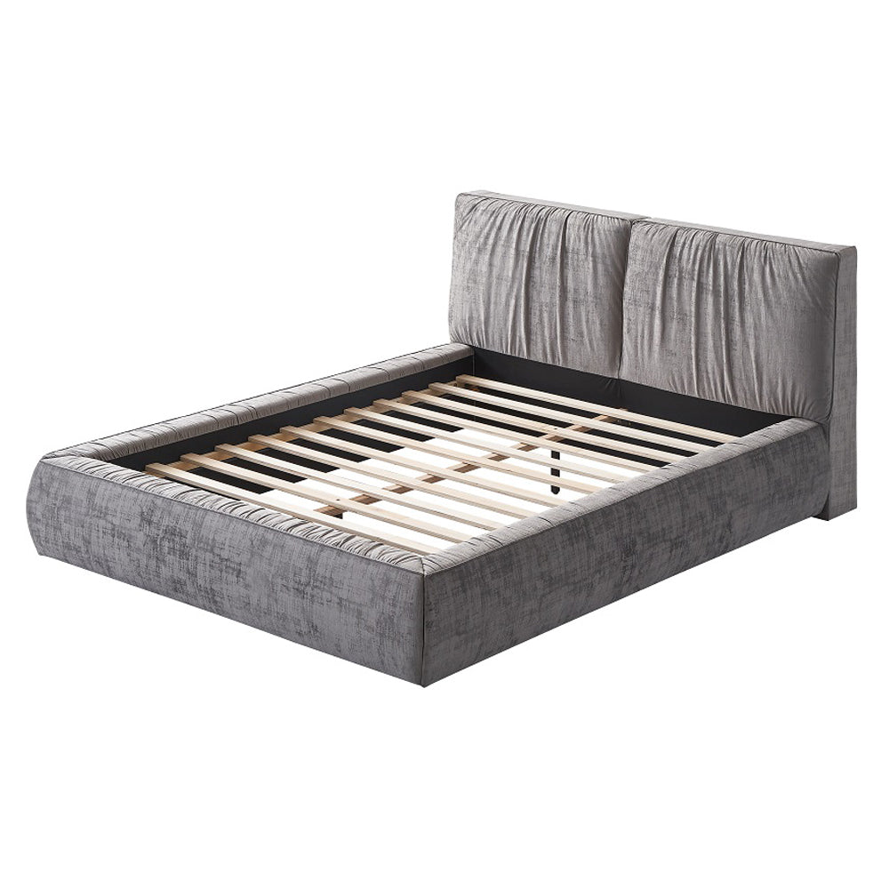 Our Onfroi bed is a fully upholstered platform bed that boasts a lush gray velvet textile, a squared profile, and contemporary vibes. The ultra-plush beadboard and frame will create a tranquil feeling in your bedroom. No need for a box spring; this platform bed includes a slat system. Simply top with your choice of mattress and coziest blankets and you’re on your way to the finest slumber of your life. This bed feels like resting on the silkiest cloud.