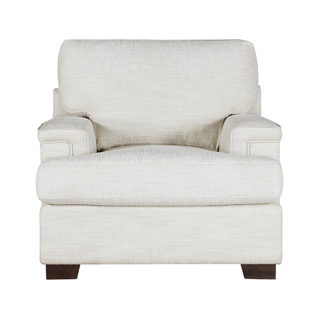 Subtle modern elegance lends its design inspiration to create the lines of the Orson Collection. Substantially sized for your comfort, the distinct profile of the chair lends ample seating space to your living room. Cream chenille fabric upholstery covers the collection with espresso-hued wood legs providing support.