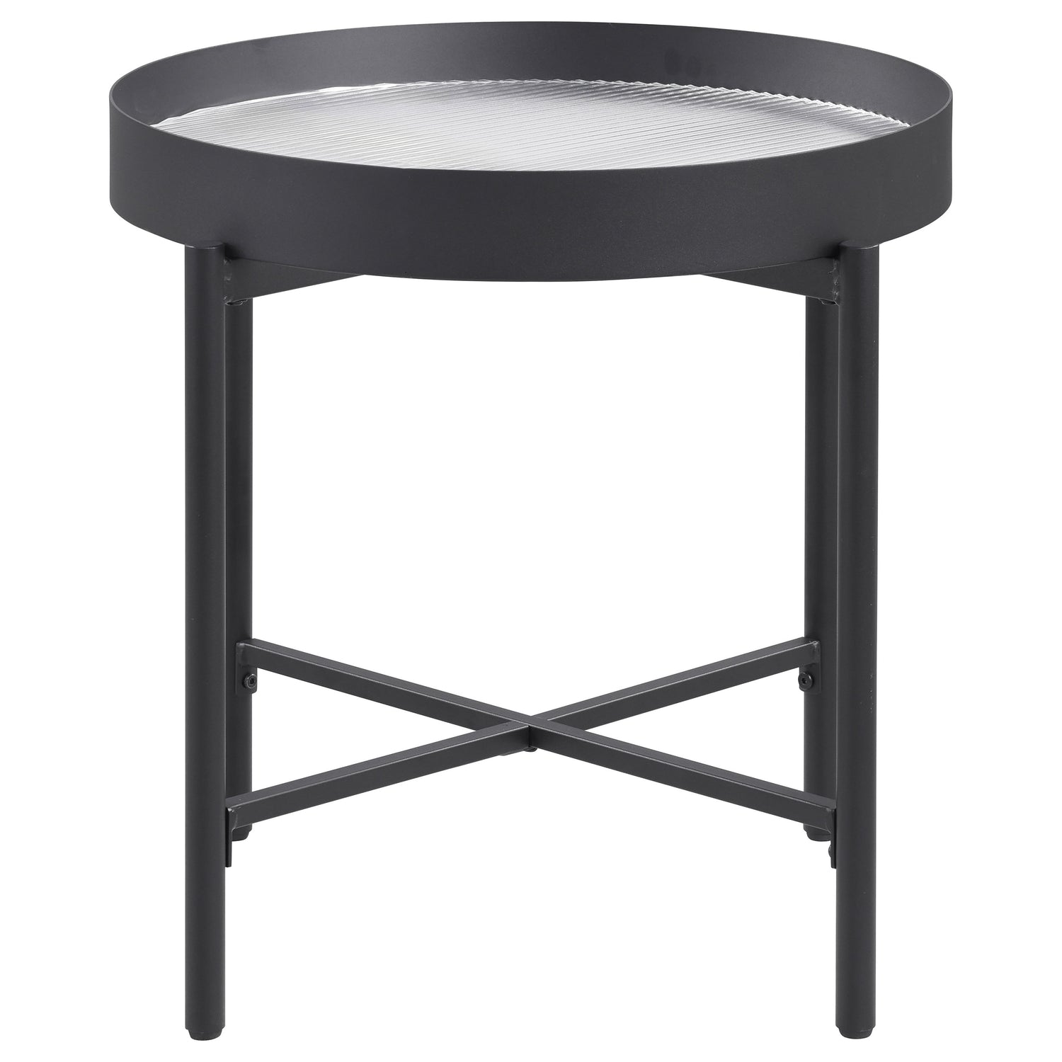 Description: This sophisticated coffee table set seamlessly blends modern design with functional versatility. The coffee table features a dynamic two-tone top with tempered reeded glass and a sliding wood surface that reveals hidden storage. Its sturdy black metal frame ensures durability, while the end table’s sleek construction and reeded glass top add a refined touch. Finished in a sandy black powder coat, this occasional table set enhances any living room with contemporary style and practical elegance.