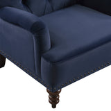 - Material: Solid wood and plywood frame, Dacron wrapped foam cushions, Velvet fabric upholstery, Attached back and seat cushions, Button-tufted chair back, Exposed wood legs with espresso finish, Nailhead trim, Assembly required, Weight capacity: 300lbs