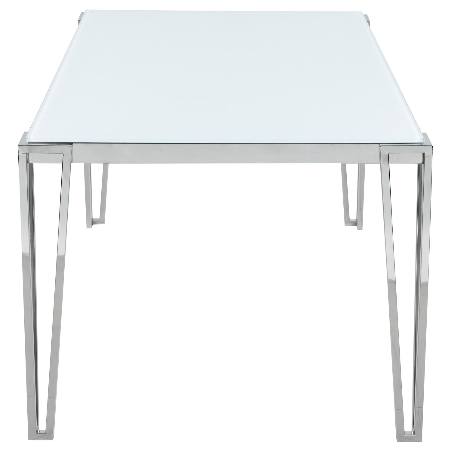 Perfect for contemporary dining rooms, this rectangle dining table offers seating for up to six guests. Designed with clean lines and a minimal silhouette, this table can be used a more casual modern piece or elevated into a formal dining table. Built of sturdy stainless steel metal with a polished chrome finish, it's easy to maintain and made to last for many years in the home. Each hairpin-inspired leg is made modern with slim corner brackets. Rested on top of a white frosted tempered glass tabletop surface that can complement your home's already existing colors.