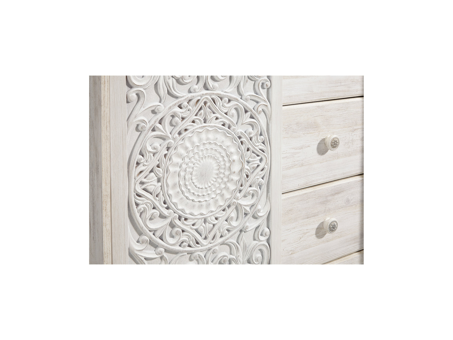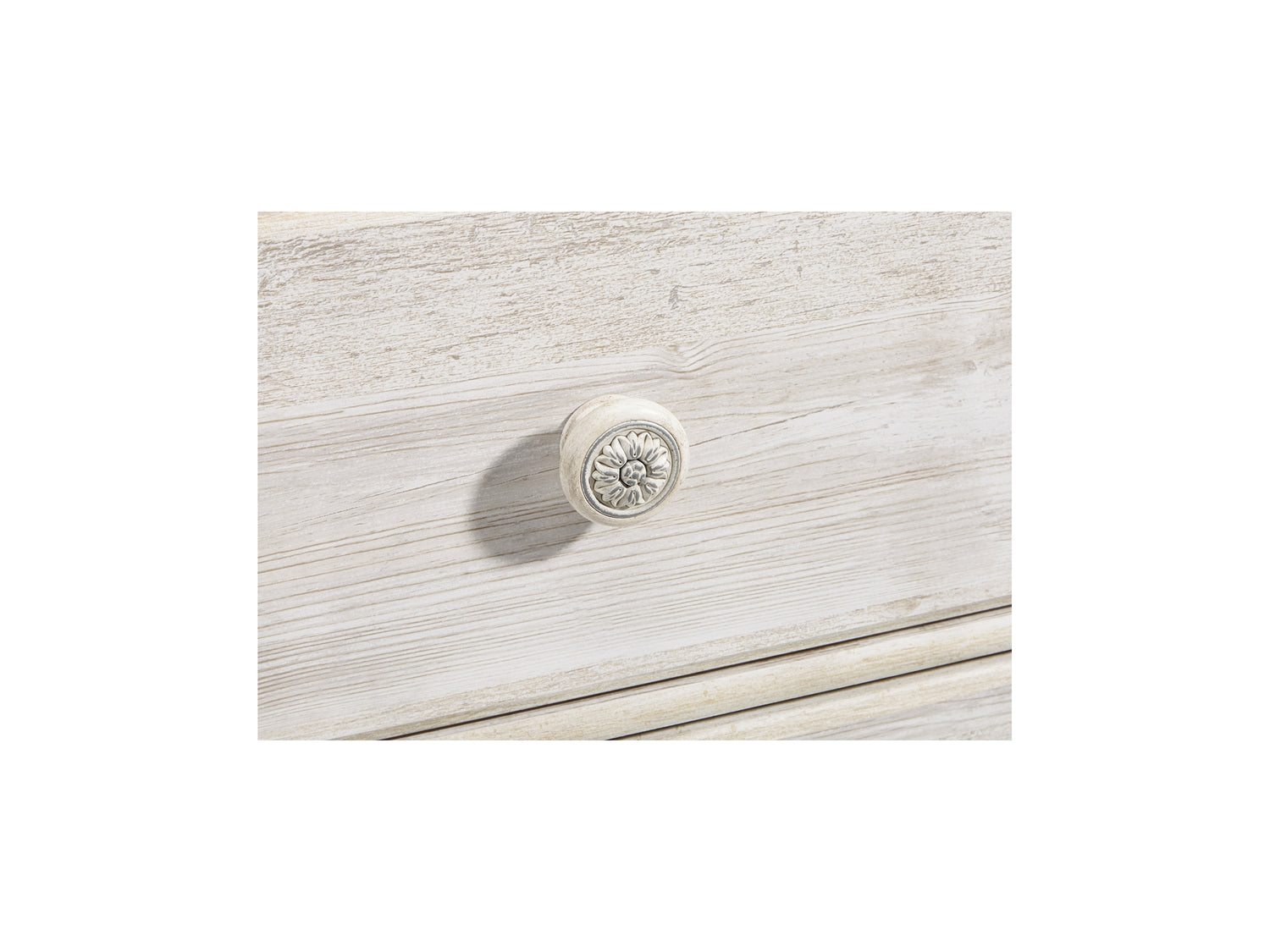 Series Features: White wash replicated worn through paint with authentic touch. Exquisite carved medallion pattern on the headboard and cases. Headboard legs have multiple height options for optimal relationship to bedding height. Cases feature ornate hardware in a worn through painted look. Drawer interiors are lined with a replicated linen design for a clean, finished look. Bedroom collection features case pilasters for a substantial look. Panel headboards (53,87,57) are compatible with EB1181 platform beds (111,112,113). Slim profile dual USB charger located on the back of the night stand tops. Mirror (36) has the versatility to mount on the dresser or to the wall horizontally or vertically. Safety is a top priority, clothing storage units are designed to meet the most current standard for stability, ASTM F 2057 (ASTM International). Drawers extend out to accommodate maximum access to drawer interior while maintaining safety.