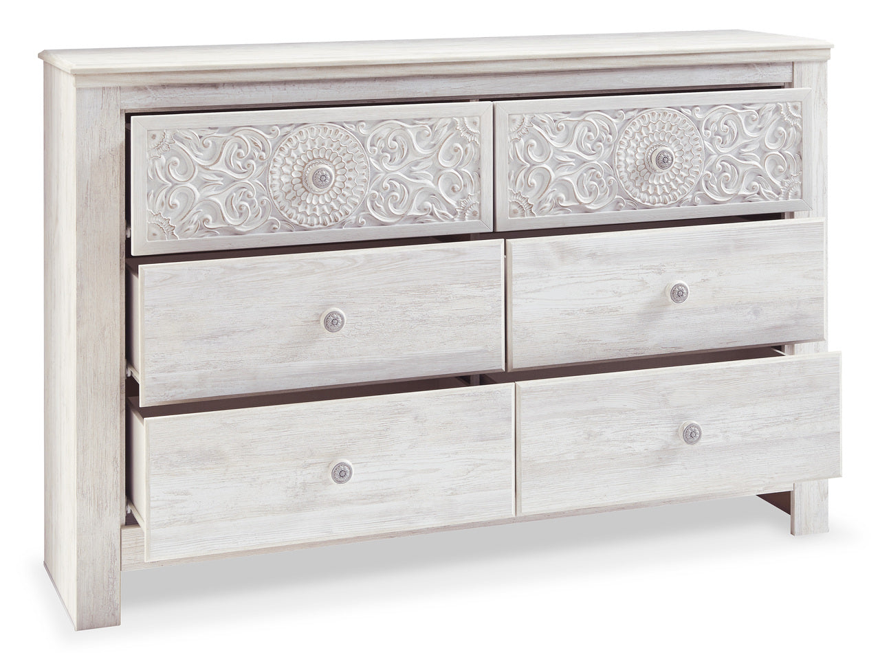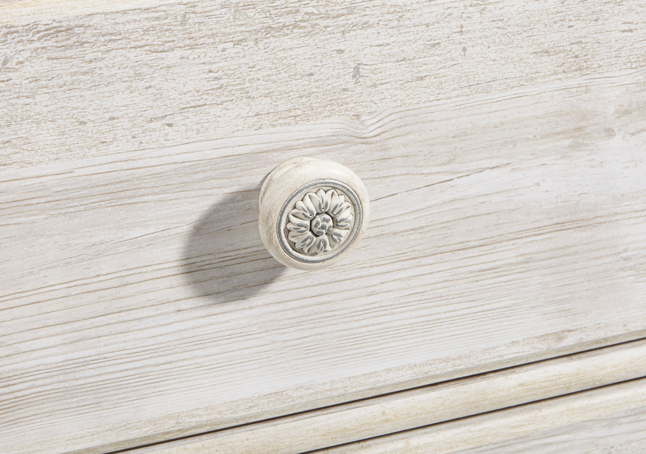 - Dressing Chest features 5 smooth-gliding drawers, slider door revealing open storage and 3 adjustable shelvesBox spring required
