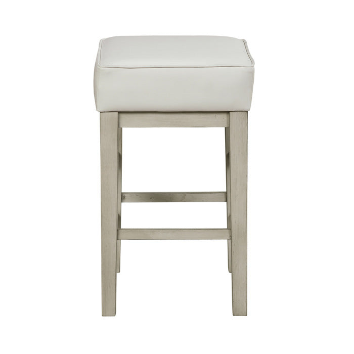 The pittsville collection is the ideal piece to incorporate into the informal dining areas of your house because of its transitional design aesthetic and versatile variety of pieces. the stool with a counter height of 24 inches can work wonderfully for you in any setting, whether you want to complement an existing table, add seats to your countertop, or create a spot for more relaxed socializing. the artistic versatility of the square faux leather seat in white is enhanced by the white-finished wood framing that surrounds it.