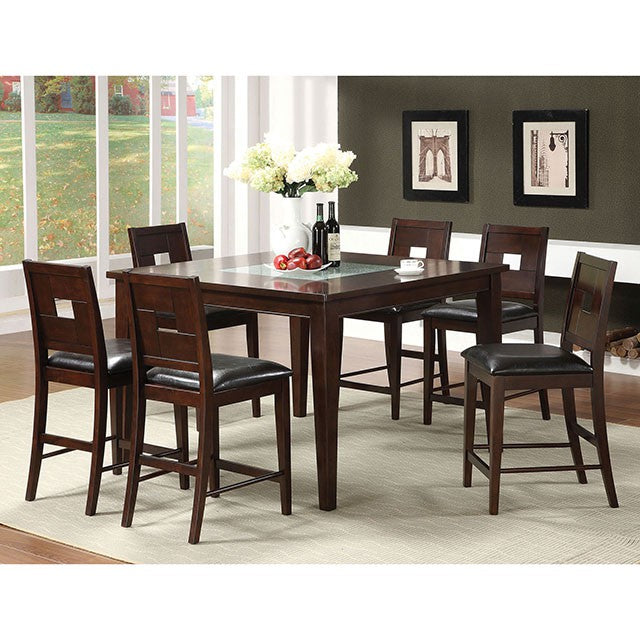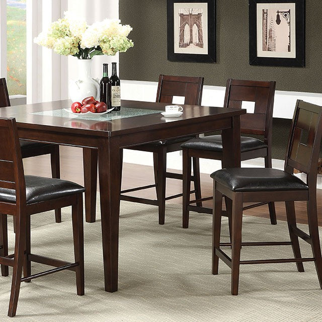 Upgrade your home with this contemporary counter height dining group. Cracked glass inserts in the dining top are a complementary contrast to the dark walnut finish. Modern keyhole back chairs with upholstered leatherette seats finish this great look.