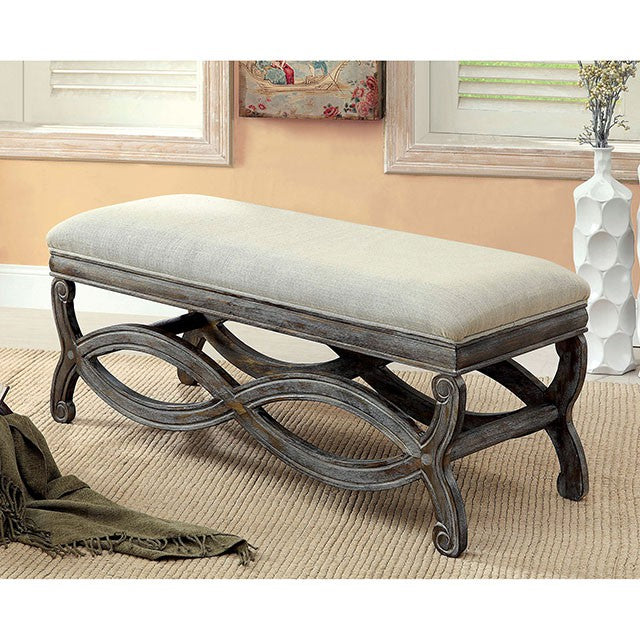 A unique reclaimed gray finish combined with distinct crossed leg design makes this bench a perfect match for a rustic themed home. Seat is padded and upholstered in neutral fabric.