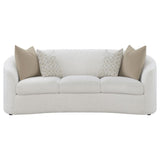 Create your inviting living room with this curved contemporary sofa, upholstered in a softly textured latte boucle upholstery throughout its elegantly designed, contoured silhouette and sloped armrests. Matching accent pillows with premium faux down fill offer extra comfort to this light and bright sofa, resting along seating with three plush cushions.